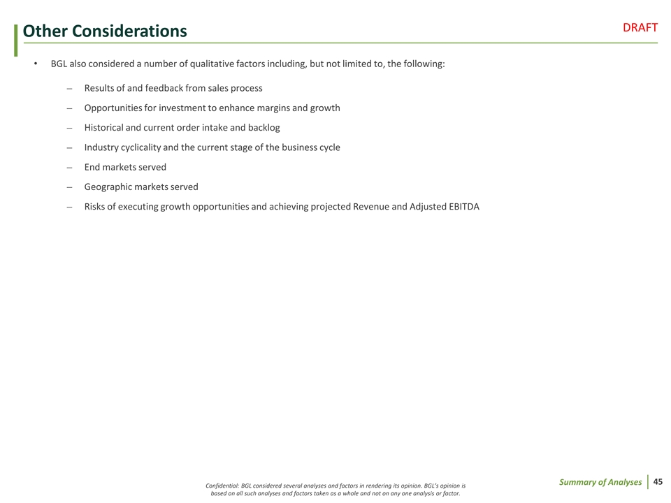 其他考虑因素草案• BGL还考虑了一些定性因素,包括但不限于:–销售过程的结果和反馈–投资机会以提高利润率和增长–历史和当前的订单接收和积压–行业周期性和商业周期的当前阶段–服务的终端市场–服务的地理市场–执行增长机会和实现预计收入和调整后EBITDA的风险45分析摘要机密:BGL在发表意见时考虑了几项分析和因素。BGL的意见是基于所有这些分析和因素作为一个整体,而不是基于任何一个分析或因素。
