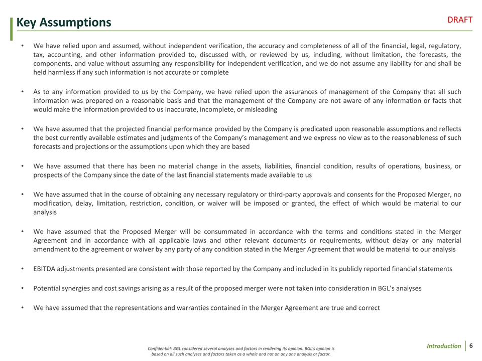 关键假设草案•我们依赖并假定,未经独立核实,向我们提供、与我们讨论或审查的所有财务、法律、监管、税务、会计和其他信息的准确性和完整性,包括但不限于预测、组成部分和价值,但不承担任何独立核实的责任,如果任何此类信息不准确或不完整,我们不承担任何责任,也不应被视为无害•至于公司向我们提供的任何信息,我们依赖公司管理层的保证,即所有这些信息都是在合理的基础上编制的,公司管理层不知道有任何信息或事实会使提供给我们的信息不准确、不完整,或具有误导性•我们假设公司提供的预计财务业绩是基于合理的假设,并反映了公司管理层目前可获得的最佳估计和判断,我们不对此类预测和预测的合理性或其所依据的假设发表任何看法•我们假设资产、负债、财务状况、经营业绩、业务、自向我们提供的上一份财务报表之日起公司的或前景•我们假设,在就拟议合并获得任何必要的监管或第三方批准和同意的过程中,不会施加或授予任何修改、延迟、限制、限制、条件或豁免,其影响将对我们的分析产生重大影响•我们假设,拟议合并将根据合并协议中规定的条款和条件以及所有适用法律和其他相关文件或要求完成,没有延迟或对协议进行任何重大修改或任何一方放弃合并协议中规定的对我们的分析具有重要意义的任何条件•提出的EBITDA调整与公司报告的一致,并包含在其公开报告的财务报表中• BGLL的分析未考虑拟议合并产生的潜在协同效应和成本节约•我们假设认为合并协议中所载的陈述和保证是真实和正确的6引言机密:BGL在发表意见时考虑了几项分析和因素。BGL的意见是基于所有这些分析和因素作为一个整体,而不是基于任何一个分析或因素。