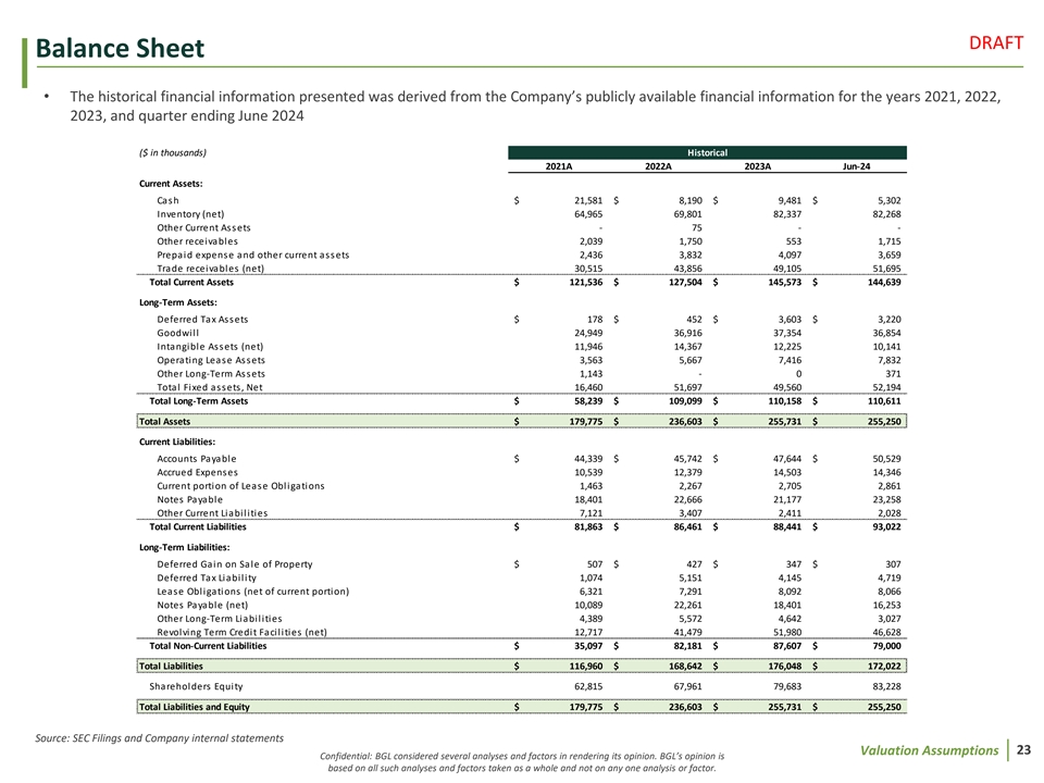 资产负债表草案•列报的历史财务信息来源于公司公开的2021年度、2022年度、2023年度财务信息,和截至2024年6月的季度(千美元)历史2021A 2022A 2023A 6月24日流动资产:现金21,581美元8,190美元9,481美元5,302美元存货(净额)64,96569,80182,33782,268其他流动资产-75--其他应收款2,0391,7505531,715预付费用和其他流动资产2,4363,8324,0973,659贸易应收款(净额)30,51543,85649,10551,695流动资产总额$ 121,536 $ 127,504 $ 145,573 $ 144,639长期资产:递延税项资产$ 178 $ 452 $ 3,603 $ 3,220商誉24,94936,91637,35436,854无形资产(净额)11,94614,36712,22510,141经营租赁资产3,5635,6677,4167,832其他长期资产1,143-0371固定资产总额,净额16,46051,69749,56052,194长期资产总额$ 58,239 $ 109,099 $ 110,158 $ 110,611总资产$ 179,775 $ 236,603 $ 255,731 $ 255,250流动负债:应付账款$ 44,339 $ 45,742 $ 47,644 $ 50,529应计费用10,53912,37914,50314,346租赁债务的流动部分1,4632,2672,7052,861应付票据18,40122,66621,17723,258其他流动负债7,1213,4072,4112,028流动负债总额$ 81,863 $ 86,461 $ 88,441 $ 93,022长期负债:出售财产的递延收益$ 507 $ 427 $ 347 $ 307递延税项负债租赁债务(扣除流动部分)6,3217,2918,0928,066应付票据(净额)10,08922,26118,40116,253其他长期负债4,3895,5724,6423,027循环定期信贷融资(净额)12,71741,47951,98046,628非流动负债总额$ 35,097 $ 82,181 $ 87,607 $ 79,000总负债$ 116,960 $ 168,642 $ 176,048 $ 172,022股东权益62,81567,96179,68383,228总负债和权益$ 179,775 $ 236,603 $ 255,731 $ 255,250资料来源:SEC文件和公司内部报表23估值假设保密:BGL在发表意见时考虑了几项分析和因素。BGL的意见是基于所有这些分析和因素作为一个整体,而不是基于任何一个分析或因素。