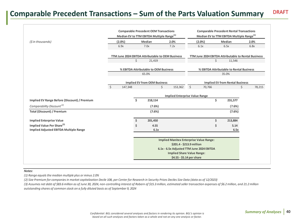 可比先例交易草案– OEM可比先例原始设备制造商估值摘要(1)交易EV与TTM EBITDA倍数范围中位数(单位:千美元)(2.0%)中值2.0% 6.9x 7.0x 7.2x TTM 2024年6月调整后EBITDA 32,965美元隐含企业价值范围前隐含EV范围(折扣)/溢价226,775美元236,031美元(2)可比性折扣(7.6%)(7.6%)总(折扣)/溢价(7.6%)(7.6%)隐含企业价值209,449美元217,998美元(3)每股隐含价值4.93美元5.34美元隐含调整后EBITDA倍数范围6.4x 6.6x隐含Manitex企业价值范围:209.4美元-2.18亿美元6.4x0 EBITDA隐含股份价值区间:每股4.93美元-5.34美元注:(1)区间等于正负中值倍数正负2.0%(2)市值十分位10B的公司的规模溢价,根据证券价格十分位规模数据研究中心(数据截至12/2023)(3)假设截至2024年6月30日的净债务为8360万美元,Rabern的非控股权益为1530万美元,估计卖方交易费用为620万美元,截至9月9日,在完全稀释的基础上,普通股流通股为2120万股,202439分析摘要机密:BGL在发表意见时考虑了几项分析和因素。BGL的意见是基于所有这些分析和因素作为一个整体,而不是基于任何一个分析或因素。