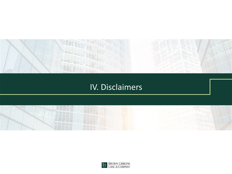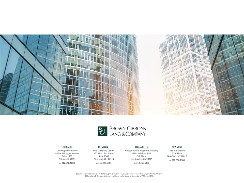 芝加哥克利夫兰洛杉矶草案纽约芝加哥克利夫兰洛杉矶纽约One Magnificent Mile One Cleveland Center 哈德森太平洋地产 Building 489 5th Avenue One Magnificent Mile One Cleveland Center TERM0美洲中心大道980 N. Michigan Avenue 1375East 9th Street 11601 Wilshire Blvd. 23rd Floor 980 N. Michigan Avenue 1375East 9th Street 11601 Wilshire Blvd. 6th Avenue Suite 1800 Suite 2500 5th Floor New York,NY 10017 Suite 1800 Suite 2500 5th Floor 27th Floor Chicago,IL 60611 Cleveland,OH 44114 Los Angeles,加利福尼亚州 90025 p. 917.68 8.2780 Chicago,IL 60611 Cleveland,OH 44114 Los Angeles,加利福尼亚州 90025 New York,NY 10019 p. 312.658.1 600 p. 216.92 0.66 13 p. 310.266.5367 p. 312.658.160 p. 216.92 0.66 13 p. 310.266.5367 p. 917.68 8.2780证券交易通过Brown,Gibbons,Lang & Company Securities,LLC进行,Brown Securities的关联公司交易通过Brown,Gibbons,Lang & Company Securities,LLC进行,该公司是58 Gibbons Lang & Company LLC的关联公司,也是FINRA和SIPC的注册经纪交易商和成员。机密:BGL在发表意见时考虑了几项分析和因素。BGL的意见是Brown Gibbons Lang & Company LLC,是一家注册经纪交易商,也是FINRA和SIPC的成员。基于所有这些分析和因素作为一个整体而不是基于任何一个分析或因素。