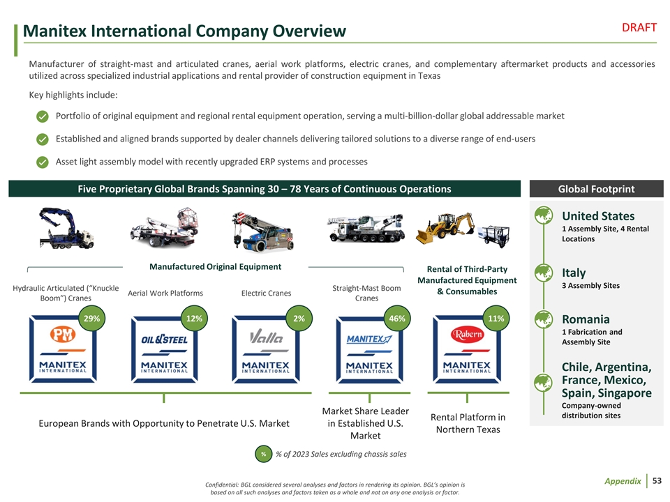 草案摩尼综合机械公司概况直桅和铰接式起重机、高空作业平台、电动起重机以及用于德克萨斯州建筑设备的专业工业应用和租赁供应商的互补售后市场产品和配件的制造商,主要亮点包括:原始设备组合和区域租赁设备运营,服务数十亿美元的全球潜在市场经销商渠道支持的已建立和调整的品牌,为各种最终用户提供量身定制的解决方案,最近升级了ERP系统和流程的轻资产组装模式五个专有的全球品牌,跨越30 – 78年的持续运营全球足迹美国1个组装场地、4个租赁地点制造的第三方意大利的原始设备租赁制造的设备3个装配场地液压铰接(“节直桅杆和耗材高空作业平台电动起重机吊杆”)起重机起重机29% 12% 2% 46% 11%罗马尼亚1个制造和组装场地智利、阿根廷、法国、墨西哥、西班牙,新加坡公司拥有的市场份额领导者分销网站欧洲品牌的租赁平台有机会在成熟的美国北德克萨斯市场渗透美国市场2023年销售额的%%不包括底盘销售53附录机密:BGL在发表意见时考虑了几项分析和因素。BGL的意见是基于所有这些分析和因素作为一个整体,而不是基于任何一个分析或因素。