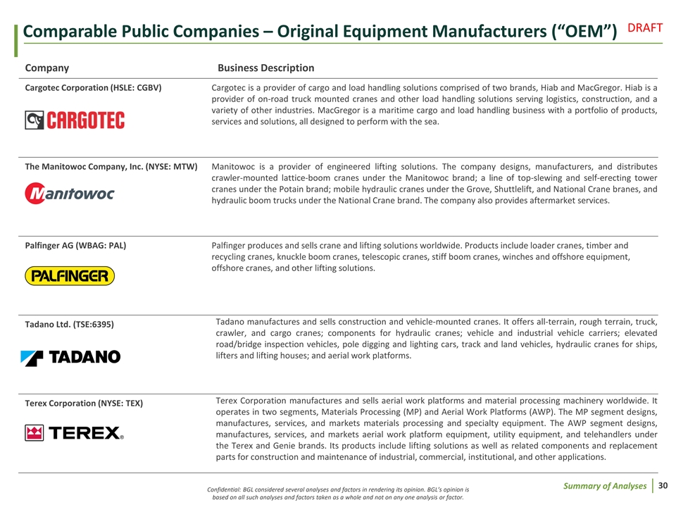 可比上市公司草案•可比上市公司分析涉及对表现出与公司相似的业务、地域、经营和财务特征的上市公司的分析。因此,这一方法的运作假设是,可比公司在公开市场的估值应该相似• BGL审查了公开交易的原始设备制造商(“OEM”)和设备租赁公司的交易倍数•五家涉及原始设备制造的上市公司和四家涉及设备租赁的上市公司被选入可比集团•虽然在业务导向方面大体相似,但这些公司在规模、增长、财务业绩、资本、地点、地域多元化、业务线多元化以及市场对未来业绩的预期方面存在有意义的差异,所有这些都对市场估值产生重要影响•就公司与可比公司的比较作出以下观察:–可比性:–规模:Manitex的收入大大低于可比公司的收入。通常情况下,较小的公司以低于较大公司的价格进行交易–增长:从历史上看,公司总体上经历了与选定可比公司的中位数和平均增长率相似的收入增长–利润率:以EBITDA利润率衡量,公司的盈利能力与可比公司的EBITDA利润率中位数相似。通常情况下,盈利能力较高的公司比盈利能力较低的公司溢价交易–控制权:公众公司的个别股份代表非控股所有权权益。控制性权益被认为比非控制性权益具有更大的价值,因为它赋予所有者影响业务的能力。通常,为公司的控股权支付溢价–流动性:交易活跃的公众公司的股票通常可以在公开市场上快速清算,而不会造成实质性的价值损失。公司股票一般无法在不造成重大价值损失的情况下迅速清算,因此,与可比上市公司相比,估值通常会有折扣• BGLL的分析侧重于企业价值与OEM集团在独立基础上以及两个可比集团在加权基础上归属于各自业务部门对EBITDA贡献的过去12个月EBITDA的交易倍数。本次分析考虑了额外的交易倍数29分析摘要机密:BGL在发表意见时考虑了几项分析和因素。BGL的意见是基于所有这些分析和因素作为一个整体,而不是基于任何一个分析或因素。