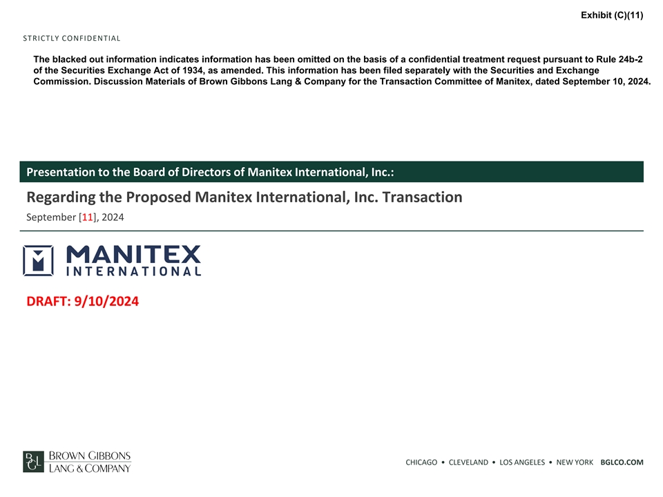 附件(c)(11)严格保密涂黑的信息表明根据经修订的1934年证券交易法规则24b-2根据保密处理请求遗漏了信息。这些信息已分别提交给美国证券交易委员会。Brown Gibbons Lang & Company为Manitex交易委员会提供的讨论材料,日期为2024年9月10日。向Manitex International, Inc.董事会所作的介绍:关于拟议的Manitex International, Inc.交易2024年9月[ 11 ]日草案:2024年8月9日/10/2024年8月芝加哥•克里夫兰•洛杉矶•纽约BGLCO.com