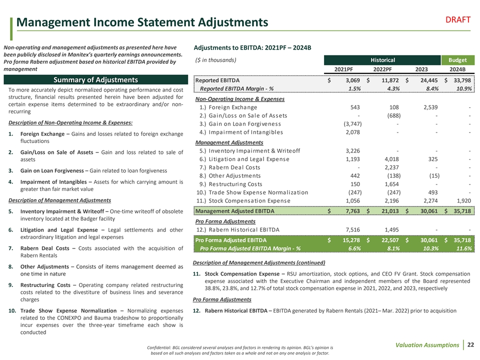 此处所示的管理损益表调整草案非经营和管理调整对EBITDA有调整:2021PF – 2024B已在Manitex的季度收益公告中公开披露。(单位:千美元)历史预算备考Rabern调整基于管理层提供的历史EBITDA 2021PF 2022PF 20232024B调整摘要报告的EBITDA 3,069美元11,872美元24,445美元33,798美元报告的EBITDA利润率-% 1.5% 4.3% 8.4% 10.9%以更准确地描述正常化的经营业绩和成本结构,此处提供的财务业绩已针对营业外收入和支出进行了调整,某些费用项目被确定为非常和/或非-1。)外汇5431082,539-经常性2.)出售资产损益-(688)--营业外收入和费用说明:3.)贷款减免收益(3,747)---4.)无形资产减值2,078----1。外汇–与外汇波动有关的损益管理调整5.)存货减值及核销3,226----2。出售资产损益–与出售资产相关的损益6.)诉讼和法律费用1,1934,018325-7.)Rabern交易成本-2,237--3。贷款减免收益–与贷款减免相关的收益8.)其他调整442(138)(15)-4。无形资产减值–账面价值为9.的资产。)重组成本1501,654--高于公允市场价值10.)贸易展览费用正常化(247)(247)493-管理层调整说明11.)股票补偿费用1,0562,1962,2741,9205。库存减值和核销–一次性注销过时管理调整后EBITDA 7,763美元21,013美元30,061美元35,718美元位于Badger设施的库存备考调整6。诉讼和法律费用–法律和解和其他12.)Rabern历史EBITDA 7,5161,495--特别诉讼和法律费用备考调整后EBITDA 15,278美元22,507美元30,061美元35,7187。Rabern交易成本–与收购备考调整后EBITDA利润率相关的成本-% 6.6% 8.1% 10.3% 11.6% Rabern Rentals管理层调整说明(续)8。其他调整–包括被视为一次性性质的项目管理11。股票补偿费用– RSU摊销、股票期权和CEO FV授予。与执行主席和董事会独立成员相关的股票补偿费用代表9。重组成本–运营公司相关重组分别占2021、2022和2023年股票补偿费用总额的38.8%、23.8%和12.7%,分别与业务线剥离相关的成本和遣散费备考调整10。贸易展览费用正常化–费用正常化12。Rabern历史EBITDA – Rabern Rentals(2021 – 2022年3月)在与CONEXPO和Bauma贸易有关的收购之前产生的EBITDA展览在三年时间范围内按比例产生费用每个展览都进行22估值假设保密:BGL在发表意见时考虑了几项分析和因素。BGL的意见是基于所有这些分析和因素作为一个整体,而不是基于任何一个分析或因素。