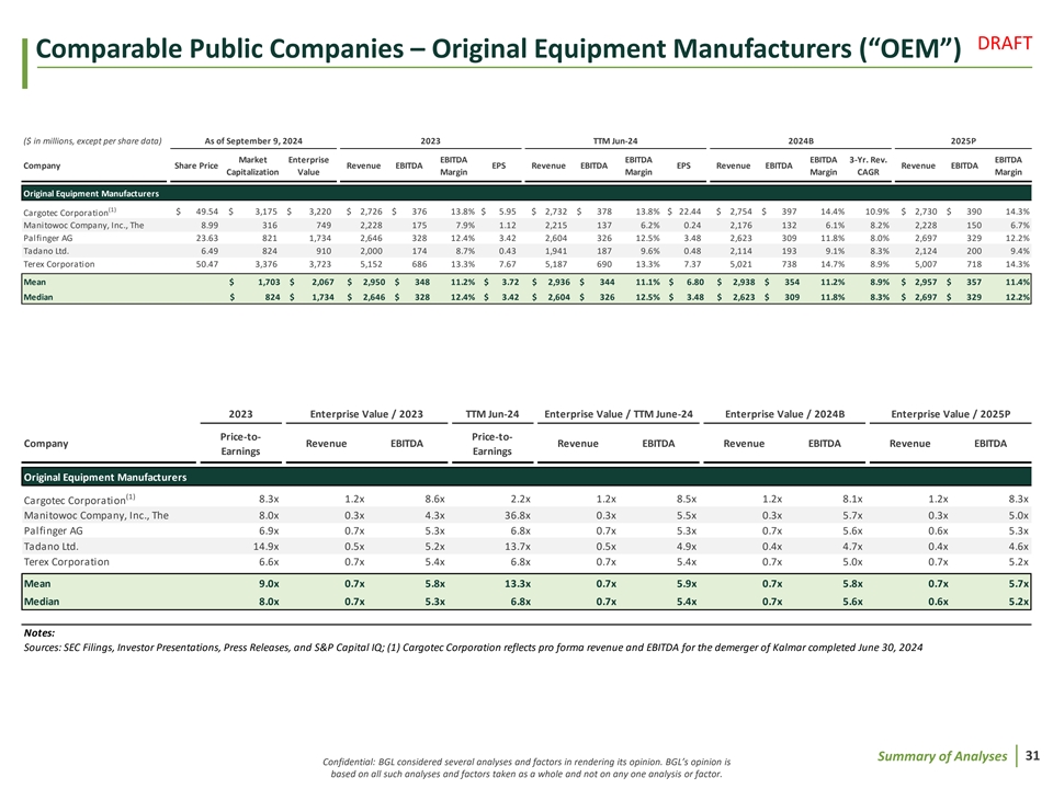 可比上市公司草案–原始设备制造商(“OEM”)(百万美元,每股数据除外)截至2024年9月9日2023 TTM Jun-24 2024B 2025P市场企业EBITDA EBITDA 3年。Rev. EBITDA公司股价收入EBITDA EPS收入EBITDA EPS收入EBITDA收入EBITDA资本化价值利润率CAGR利润率原始设备制造商(1)$ 49.54 $ 3,175 $ 3,220 $ 2,726 $ 37613.8% $ 5.95 $ 2,732 $ 37813.8% $ 22.44 $ 2,754 $ 39714.4% 10.9% $ 2,730 $ 39014.3% Cargotec Corporation Manitowoc Company,Inc.,The 8.993167492,2281757.9% 1.12 2,2151376.2% 0.24 2,1761326.1% 8.2% 2,2281506.7% Palfinger AG 23.638211,7342,64632812.4% 3.42 2,60432612.5% 3.48 2,62330911.8% 8.0% 2,69732912.2% Tadano Ltd. 6.498249102,0001748.7% 0.431,9411879.6% 0.48 2,1141939.1% 8.3% 2,124200.9.4% Terex Corporation50.473,3763,7235,15268613.3% 7.675,18769013.3% 7.375,02173814.7% 8.9% 5,00771814.3%均值$ 1,703 $ 2,067 $ 2,950 $ 34811.2% $ 3.72 $ 2,936 $ 34411.1% $ 6.80 $ 2,938 $ 35411.2% 8.9% $ 2,957 $ 35711.4%中值$ 824 $ 1,734 $ 2,646 $ 32812.4% $ 3.42 $ 2,604 $ 32612.5% $ 3.48 $ 2,623 $ 30911.8% 8.3% $ 2,697 $ 32912.2% 2023企业价值/2023 TTM Jun-24企业价值/TTM Jun-24企业价值/2024B企业价值/2025P价格对价格公司收入EBITDA收入EBITDA收入EBITDA收入EBITDA收入EBITDA收入EBITDA收入EBITDA收入EBITDA收入EBITDA收入EBITDA收入EBITDA收入EBITDA盈余盈余原始设备制造商(1)8.3x 1.2x 8.6x 2.2x 1.2x 8.5x 1.2x 8.1x 1.2x 8.3x Cargotec Corporation Manitowoc Company,Inc.,8.0x 0.3x 4.3x 36.8x 0.3x 5.5x 0.3x 5.7x 0.3x 5.0x Palfinger AG 6.9x 0.7x 5.3x 6.8x 0.7x 5.3x 0.7x 5.6x 0.6x 5.3x Tadano Ltd. 14.9x 0.5x 5.2x 13.7x 0.5x 4.9x 0.4x 4.7x 0.4x 4.6x Terex Corporation 6.6x 0.7x 5.4x 6.8x 0.7x 5.4x 0.7x 5.0x 0.7x 5.2x均值9.0x 0.7x 5.8x 13.3x 0.7x 5.9x 0.7x 5.8x 0.7x 5.7x中值8.0x 0.7x 5.3x 6.8x 0.7x 5.4x 0.7x 5.6x 0.6x 5.2x注:资料来源:SEC文件、投资者介绍、新闻稿和TERM0202431分析摘要机密:BGL在发表意见时考虑了几项分析和因素。BGL的意见是基于所有这些分析和因素作为一个整体,而不是基于任何一个分析或因素。