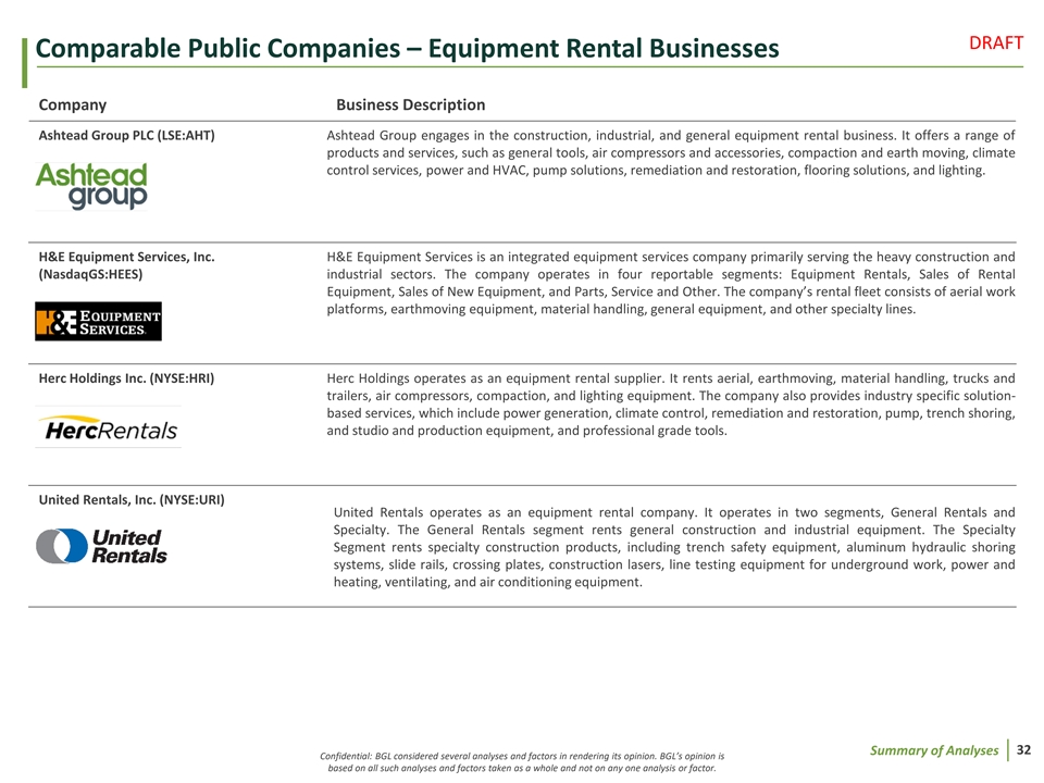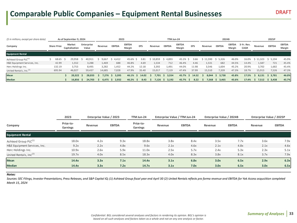 可比上市公司草案–设备租赁业务(百万美元,每股数据除外)截至2024年9月9日2023 TTM Jun-24 2024B 2025P市场企业EBITDA EBITDA 3年。Rev. EBITDA公司股价收入EBITDA EPS收入EBITDA EPS收入EBITDA收入EBITDA资本化价值利润率CAGR利润率设备租赁(1)$ 68.65 $ 29,958 $ 40,911 $ 9,667 $ 4,41245.6% $ 3.81 $ 10,859 $ 4,89345.1% $ 3.66 $ 11,590 $ 5,32646.0% 16.0% $ 11,323 $ 5,19445.9% Ashtead Group PLC H&E设备服务,Inc. 42.991,5523,2881,46968846.8% 4.691,53471246.4% 4.461,53168244.5% 14.4% 1,58772145.4% Herc Holdings Inc. 13 2.193,7538,4953,2821,45244.2% 12.183,3921,49144.0% 11.983,5461,60445.2% 20.9% 3,7021,68245.4%(2)695.94 46,02759,43714,6857,02847.9% 35.4015,0177,11947.4% 37.99 15,5107,33947.3% 18.7% 15,9137,52647.3% 联合租赁,Inc.均值$ 20,322 $ 28,033 $ 7,276 $ 3,39546.1% $ 14.02 $ 7,701 $ 3,55445.7% $ 14.52 $ 8,044 $ 3,73845.8% 17.5% $ 8,131 $ 3,78146.0%中值$ 16,856 $ 24,703 $ 6,475 $ 2,93247.2% $ 8.43 $ 7,126 $ 3,19245.7% $ 8.22 $ 7,568 $ 3,46545.6% 17.4% $ 7,512 $ 3,43845.7% 2023 Enterprise Value/2023 TTM Jun-24 Enterprise Value/TTM Jun-24 Enterprise Value/2024B Enterprise Value/2025P Price-to-Company Revenue EBITDA Revenue EBITDA Revenue EBITDA Revenue EBITDA Revenue EBITDA Revenue EBITDA Rev4.2x 9.3x 18.8x 3.8x 8.4x 3.5x 7.7x 3.6x 7.9x Ashtead Group PLC H&E设备服务公司 9.2x 2.2x 4.8x 9.6x 2.1x 4.6x 2.1x 4.8x 2.1x 4.6x 4.1x 4.1x 4.6x Herc Holdings Inc. 10.9x 2.6x 5.9x 11.0x 2.5x 5.7x 2.4x 5.3x 2.3x 5.1x(2)19.7x 4.0x 8.5x 18.3x 4.0x 8.3x 3.8x 8.1x 3.7x 7.9x 联合租赁,Inc平均14.4x 3.3x 7.1x 14.4x 3.1x 6.8x 3.0x 6.5x 2.9x 6.3x中值14.4x 3.3x 7.2x 14.7x 3.1x 7.0x 3.0x 6.1x和标普 Capital IQ;(1)Ashtead Group财年4月30日结束(2)联合租赁反映了2024年3月15日完成的Yak Access收购的备考收入和EBITDA 33分析摘要机密:BGLL在发表意见时考虑了几项分析和因素。BGL的意见是基于所有这些分析和因素作为一个整体,而不是基于任何一个分析或因素。