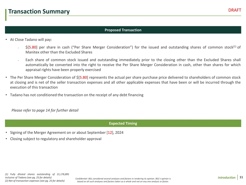 拟议交易草案摘要•收盘时,Tadano将支付:(1)–每股[ 5.80 ]美元现金(“每股合并对价”),用于Manitex除除外股份外的已发行和流通在外的普通股——除除外股份外的紧接收盘前已发行和流通在外的每一股普通股应自动转换为以现金收取每股合并对价的权利,已适当行使评估权的股份除外•每股[ 5.80美元]的合并对价代表在收盘时交付给普通股股东的实际每股购买价格,并扣除卖方交易费用和通过执行本次交易已经或将要发生的所有其他适用费用•忠野没有将交易以收到任何债务融资为条件,请参阅第14页了解更多详情预计时间•在9月[ 12日]或前后签署合并协议,2024年•收盘须经监管机构和股东批准(1)完全稀释后的流通股为21,176,89111(包括多田野)(见pg。25详见)机密:BGL在发表意见时考虑了几项分析和因素。BGL的意见是(2)交易费用净额(见pg。25详见)基于所有这些分析和因素作为一个整体而不是基于任何一个分析或因素。