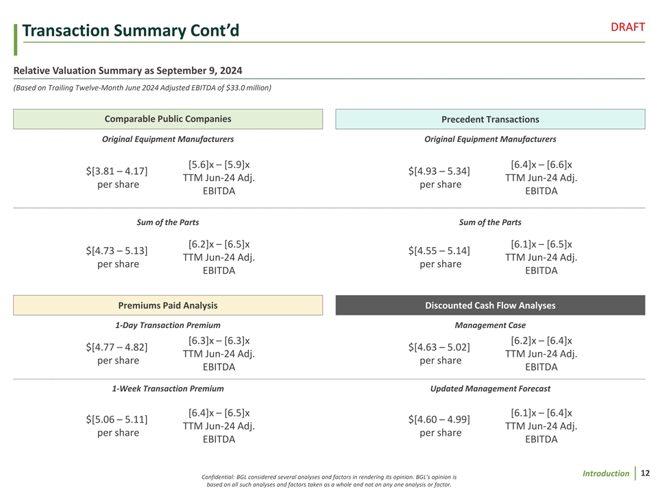 交易摘要草案续相对估值摘要截至9月9日,2024年(基于过去12个月2024年6月调整后EBITDA为33.0百万美元)可比上市公司先例交易原始设备制造商原始设备制造商[ 5.6 ] x – [ 5.9 ] x [ 6.4 ] x – [ 6.6 ] x $ [ 3.81 – 4.17 ] $ [ 4.93 – 5.34 ] TTM Jun-24 Adj. TTM Jun-24 Adj.每股EBITDA EBITDA零部件总和[ 6.2 ] x – [ 6.5 ] x [ 6.1 ] x – [ 6.5 ] x $ [ 4.73 – 5.13 ] $ [ 4.55 – 5.14 ] TTM Jun-24 Adj. TTM Jun-24 Adj.每股EBITDA EBITDA溢价支付分析折现现金流分析1天交易溢价管理案例[ 6.3 ] x – [ 6.3 ]$ [ 4.63 – 5.02 ] TTM Jun-24 Adj. TTM Jun-24 Adj.每股EBITDA 1周交易溢价更新管理层预测[ 6.4 ] x – [ 6.5 ] x [ 6.1 ] x – [ 6.4 ] x $ [ 5.06 – 5.11 ] $ [ 4.60 – 4.99 ] TTM Jun-24 Adj. TTM Jun-24 Adj.每股EBITDA 12简介机密:BGLL在发表意见时考虑了若干分析和因素。BGL的意见是基于所有这些分析和因素作为一个整体,而不是基于任何一个分析或因素。