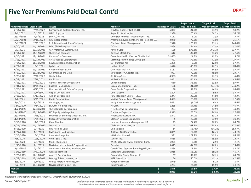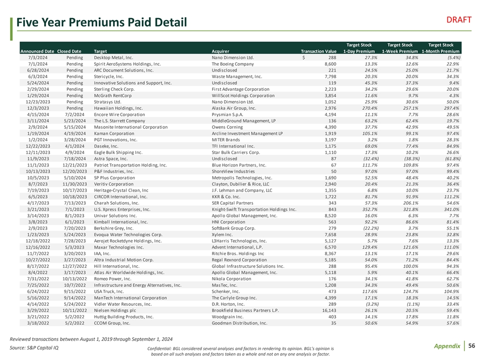 五年期已付溢价草案详情(续)目标股票目标股票目标股票公布日期截止日期目标收购方交易价值1日溢价1周溢价1个月溢价2/14/20227/25/2022 Cornerstone Building Brands, Inc. Clayton,Dubilier & Rice,LLC 5,02734.0% 53.9% 50.9% 2/9/20225/2/2022丨US Ecology 丨美国生态,Inc. 共和废品处理公司,33070.4% 68.5% 50.2% 12/13/20214/5/2022 SPX FLOW,Inc. Lone Star Americas Acquisitions,Inc. 4,1121.0% 2.3% 7.8% 10/25/20212/15/2022丨PAE PAE丨Incorporated Amentum Government Services HoldingsLLC 2,518120.1% 93.1% 140.6% 9/10/20211/23/2021 Echo Global Logistics, Inc. TJC LP 1,46454.1% 47.0% 51.4% 9/3/202110/26/2021 AFA Protective Systems,Inc. Pavion Corp. 138598.1% 273.7% 317.7% 8/11/202111/12/2021 The ExOne Company丨Desktop Metal,Inc.丨61247.4% 61.7% 41.6% 8/10/202112/14/2021 堪萨斯南方铁路 Canadian Pacific Kansas City Limited 31,65511.5% 12.7% 9.7% 7/15/202110/14/2021丨GP Strategies 丨GP战略教育 Corporation Learning Technologies Group plc 42232.3% 42.0% 29.7% 7/14/202111/30Inc. CNH Industrial N.V. 2,13750.2% 34.9% 35.2% 6/17/202111/22/2021 CAI国际,Inc. Mitsubishi HC Capital Inc. 98740.3% 48.0% 33.5% 5/28/20217/28/2022丨Welbilt,Inc. Welbilt, Inc. Ali Group S.r.l. 4,93320.5% 21.3% 6.8% 4/19/202117/19/2021丨诺尔公司Knoll, Inc.MillerKnoll,Inc. 2,05140.1% 50.0% 43.6% 4/15/2021/5/21/2021 General Finance Corporation联合租赁 61055.5% 63.8% 59.0% 3/31/20218/31/2021库什L.L.C.1,24739.9% 44.0% 43.3% 2/8/20215/25/2021 立方公司 Veritas Capital Fund Management 3,49318.5% 22.7% 17.6% 2/4/20216/4/2021 CoreLogic,Inc. Insight Venture Management 8,021(1.0%)6.4% 6.6% 12/7/20204/14/2021 SEACOR Holdings Inc. First Reserve Corporation 23463.9% 63.9% 48.0% 11/16/202012/24/2020 HD Supply Holdings,Inc. 家得宝公司 10,31525.0%Inc. Hanover Investors Management LLP 2324.4% 20.7% 20.7% 9/11/20211/10/2020 Torotel,Inc. TT Group Industries,Inc. 43208.5% 193.8% 177.9% 9/11/2029/4/2020 HYB Holding Corp. Undisclosed 14(65.7%)(34.2%)(63.7%)8/27/202011/2021 BMC Stock Holdings,Inc. Builders FirstSource,Inc. 3,03913.7% 12.4% 43.1% 7/16/20210/1/2020 InnerWorkings,Inc. HH Global Limited 331127.3% 143.9% 86.3% 7/6/202010/8/2020丨Vivint Solar,Inc. 丨Sunrun Inc.迷你汽车,6389.2% 15.9% 22.3Inc. WillScot Mobile Mini Holdings Corp. 1,9018.2% 2.5% 1.1% 1/30/20207/1/2021 Navistar International Corporation Dusk Inc. 9,41584.6% 70.2% 53.8% 11/12/20192/3/2020 Continental Building Products, Inc. CertainTeed Gypsum & Ceiling USA,Inc. 1,56415.6% 21.7% 32.7% 11/6/20193/27/2020 TERM0 Limited Aircastle Limited Marubeni Corporation 6,91616.0% 19.1% 46.5% 9/23/201912/19/2019Arotech Corporation Greenbriar Equity Group,L.P. 10732.7% 26.1% 28.2% 8/28/201912/31/2019 Ecology & Environment,Inc. WInc. Guidehouse LLP 1,23416.5% 15.8% 19.1%中位数1,44628.9% 33.2% 35.2%均值2,92751.2% 50.4% 50.6% 2019年8月1日至2024年9月1日审查的交易57附录来源:标普 Capital IQ机密:BGL在发表意见时考虑了几项分析和因素。BGL的意见是基于所有这些分析和因素作为一个整体,而不是基于任何一个分析或因素。