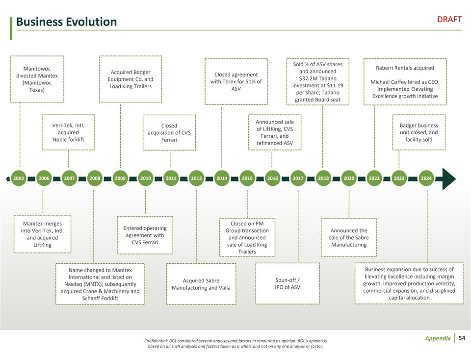 DRAFT Business Evolution出售½股ASV股份Rabern Rentals收购Manitowoc并宣布收购Badger达成封闭式协议,剥离Manitex价值3720万美元的Tadano Equipment Co.,并与Michael Coffey(Michael Coffey)聘请Michael Coffey(Michael Coffey)51%的股份。(马尼托瓦克以11.19美元的价格投资Load King Trailers ASV实施Elevating Texas)每股;Tadano Excellence Growth Initiative授予董事会席位宣布出售Veri-Tek,Intl。LiftKing的Badger业务已关闭,CVS收购的CVS部门已关闭,而法拉利、Noble叉车设施出售法拉利再融资ASV 200320062007200820092010201120132014201520162017201820202022202220232024 Manitex合并已于下午进入Veri-Tek,Intl。Group Transaction宣布与并收购并宣布出售SabreCVS法拉利 LiftKing出售Load King Manufacturing Trailers业务扩张因成功更名为Manitex Elevating Excellence包括Margin International并在被收购的Sabre分拆上市/增长、生产速度提高、纳斯达克(MNTX);随后ASV Manufacturing和Valla商业扩张的IPO,以及纪律严明的收购Crane & Machinery和资本配置Schaeff Forklift 54附录机密:BGL在发表意见时考虑了多项分析和因素。BGL的意见是基于所有这些分析和因素作为一个整体,而不是基于任何一个分析或因素。