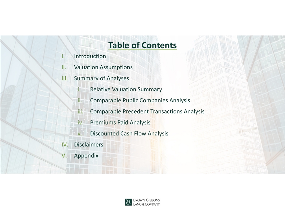 免责声明草案材料仅供讨论之用。BGL明确表示不对与材料有关的任何人承担任何和所有责任,无论是直接或间接的、合同或侵权或其他方面的责任。这些材料是为熟悉公司业务和事务的特定人员编写的,以供在特定背景下使用,并非为了公开披露或符合任何州、联邦或国际证券法或其他法律、规则或法规下的任何披露标准而编写,交易委员会、公司或BGL均不对交易委员会以外的人员使用这些材料承担任何责任。这些材料是在保密的基础上提供的,仅供交易委员会参考,未经BGL事先明确书面同意,不得全部或部分披露、汇总、复制、传播或引用或以其他方式提及。这些材料必然基于财务、经济、市场和其他有效条件,以及BGL截至材料日期可获得的信息。尽管随后的事态发展可能会影响材料的内容,但BGL没有承诺,也没有义务更新、修改或重申材料,除非BGL的约定书可能明确设想。这些材料并非旨在提供评估拟议合并的唯一依据,也并非旨在包含可能需要的所有信息。这些材料不涉及公司或任何其他方进行或实施拟议合并的基本商业决策,或与公司或任何其他方可能可用的任何替代商业战略或交易相比,拟议合并的相对优点。这些材料不构成任何意见,也不构成向董事会、交易委员会、公司、公司任何证券持有人或任何其他方提出的关于如何就与拟议合并或其他有关的任何事项投票或采取行动或是否购买或出售任何公司的任何资产或证券的建议。BGLL的唯一意见是,如果有意见,那就是实际提交给交易委员会的意见。在准备材料时,BGL作为独立承包商行事,材料中的任何内容均无意在BGL与任何一方之间建立或应被解释为建立受托关系或其他关系。这些材料可能无法反映BGL及其附属公司其他业务领域的其他专业人士所了解的信息。材料的编制是一个复杂的过程,涉及对所采用的财务、比较和其他分析方法的定量和定性判断和确定,以及这些方法对所呈现的独特事实和情况的调整和应用,因此不容易受到部分分析或概要描述的影响。此外,BGL并没有对其考虑的任何分析或因素赋予任何特定的权重,而是对每个分析和因素的重要性和相关性做出定性判断。每种分析技术都有其固有的优点和缺点,可获得信息的性质可能会进一步影响特定技术的价值。因此,必须将材料中包含的分析作为一个整体来考虑。在不考虑所有分析和因素的情况下选择部分分析、分析方法和因素可能会产生误导或不完整的观点。这些材料反映了对行业表现、一般业务、经济、监管、市场和财务状况等事项的判断和假设,其中许多超出了拟议合并参与者的控制范围。材料中包含的任何价值估计不一定表明实际价值或预测未来的结果或价值,这可能或多或少明显有利。任何有关资产、业务或证券价值的分析并不旨在是评估或反映任何资产、业务或证券可能实际出售的价格。材料不构成估值意见或信用评级。这些材料并未涉及将支付或收取的对价、与拟议合并或其他事项有关的任何安排、谅解、协议或文件的条款,或拟议合并或其他事项的形式、结构或任何其他部分或方面。此外,这些材料并未涉及拟议合并的任何部分或方面对任何一方的公平性。在准备材料时,BGL没有对任何资产进行任何实物检查或独立评估或评估, 公司或任何其他方的财产或负债(或有或其他),并且没有义务根据任何法律评估公司或任何其他方的偿债能力。47免责声明机密:BGL在发表意见时考虑了几项分析和因素。BGL的意见是基于所有这些分析和因素作为一个整体,而不是基于任何一个分析或因素。
