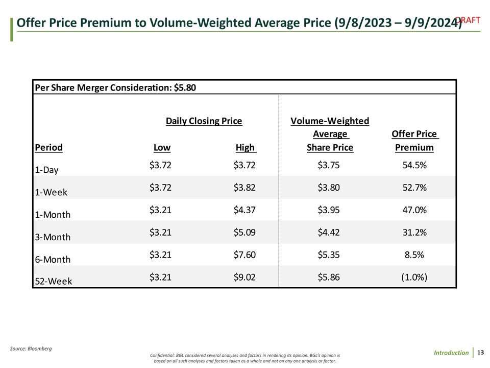 发售价草案较成交量加权平均价格溢价(9/8/2023 – 9/9/2024)每股合并对价:5.80美元每日收盘价成交量加权平均发售价期间低高股价溢价3.72美元3.72美元3.72美元3.75 54.5% 1日$ 3.72美元3.82美元3.80 52.7% 1-week $ 3.21 $ 4.37 $ 3.95 47.0% 1-month $ 3.21 $ 5.09 $ 4.42 31.2% 3-month $ 3.21 $ 7.60 $ 5.358.5% 6-month $ 3.21 $ 9.02 $ 5.86(1.0%)52周来源:彭博13简介机密:BGLL在发表意见时考虑了几项分析和因素。BGL的意见是基于所有这些分析和因素作为一个整体,而不是基于任何一个分析或因素。