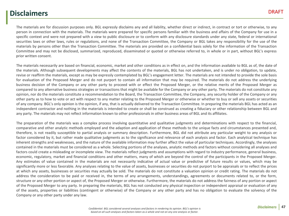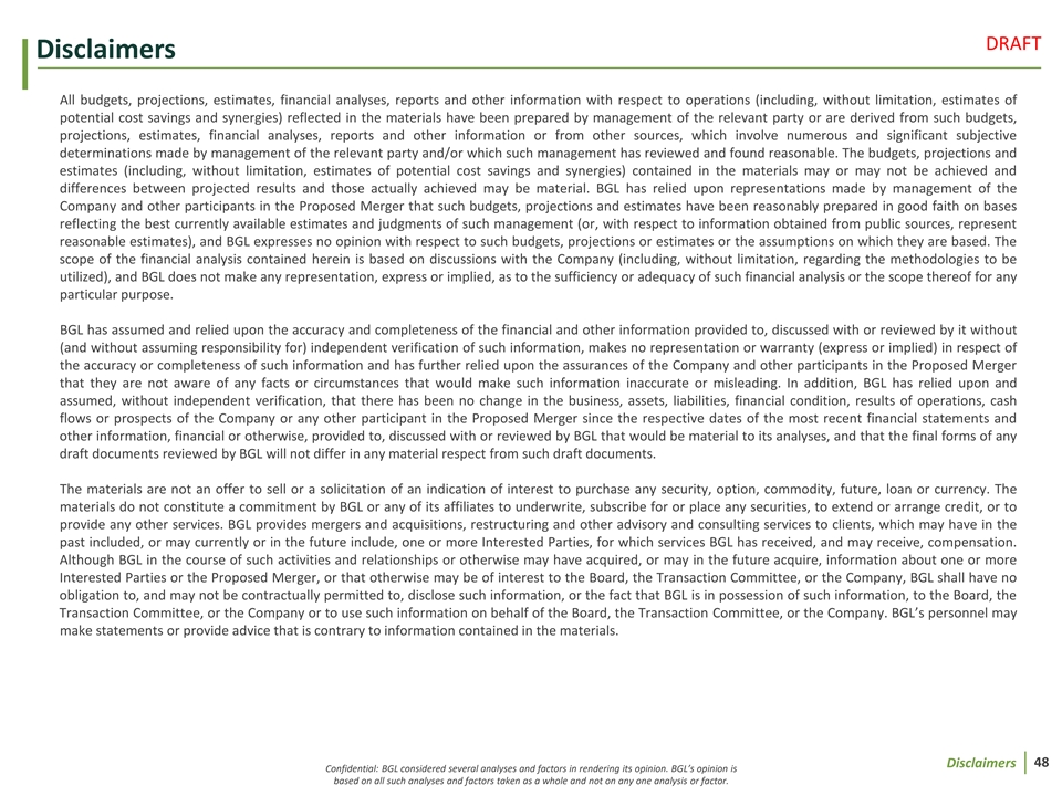 免责声明草案材料中反映的与运营有关的所有预算、预测、估计、财务分析、报告和其他信息(包括但不限于对潜在成本节约和协同增效的估计)均由相关方的管理层编制,或源自此类预算、预测、估计、财务分析、报告和其他信息或其他来源,其中涉及相关方管理层作出的大量重大主观决定和/或此类管理层审查并认为合理的。材料中包含的预算、预测和估计(包括但不限于对潜在成本节约和协同增效作用的估计)可能会实现,也可能不会实现,预计结果与实际实现的结果之间的差异可能很大。BGL依赖公司管理层和拟议合并的其他参与者所作的陈述,即此类预算、预测和估计是根据反映此类管理层目前可获得的最佳估计和判断的基础(或者,就从公共来源获得的信息而言,代表合理的估计)合理编制的,而BGL对此类预算、预测或估计或它们所依据的假设不发表意见。本文所载财务分析的范围是基于与公司的讨论(包括但不限于关于将使用的方法),BGL不对此类财务分析的充分性或充分性或其用于任何特定目的的范围作出任何明示或暗示的陈述。BGL承担并依赖向其提供、与其讨论或由其审查的财务和其他信息的准确性和完整性,而无需(也不承担责任)对此类信息进行独立核实,不对此类信息的准确性或完整性作出任何陈述或保证(明示或暗示),并进一步依赖公司和拟议合并的其他参与者的保证,即他们不知道任何会使此类信息不准确或具有误导性的事实或情况。此外,BGL在未经独立核实的情况下,依赖并假定,自最近的财务报表的相应日期以来,公司或拟议合并的任何其他参与者的业务、资产、负债、财务状况、经营业绩、现金流量或前景没有发生任何变化,以及向BGL提供、与BGL讨论或由BGL审查的对其分析具有重要意义的其他财务或其他信息,并且BGL审查的任何文件草案的最终形式在任何重大方面与此类文件草案没有任何不同。这些材料不是出售要约,也不是购买任何证券、期权、商品、期货、贷款或货币的意向邀请。这些材料不构成BGL或其任何关联公司对承销、认购或配售任何证券、提供或安排信贷或提供任何其他服务的承诺。BGLL向客户提供并购、重组和其他咨询和咨询服务,这些服务过去可能包括,现在或将来可能包括一个或多个利害关系方,BGLL已就其服务获得并可能获得补偿。尽管BGL在此类活动和关系过程中或以其他方式可能已经获得或可能在未来获得有关一个或多个利害关系方或拟议合并的信息,或董事会、交易委员会或公司可能感兴趣的其他信息,但BGL没有义务也可能不会被合同允许向董事会、交易委员会或公司披露此类信息或BGL拥有此类信息的事实,或代表董事会、交易委员会使用此类信息,或公司。BGL的人员可能会做出与材料中包含的信息相反的陈述或提供建议。48免责声明机密:BGL在发表意见时考虑了几项分析和因素。BGL的意见是基于所有这些分析和因素作为一个整体,而不是基于任何一个分析或因素。
