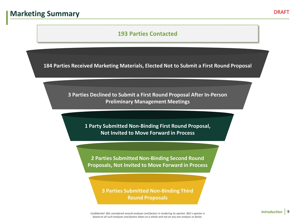营销摘要草案193个缔约方联系了184个缔约方收到营销材料,选择不提交第一轮提案3个缔约方在面对面的初步管理会议后拒绝提交第一轮提案1个缔约方提交了不具约束力的第一轮提案,未受邀在进程中推进2个缔约方提交了不具约束力的第二轮提案,未受邀在进程中推进3个缔约方提交了不具约束力的第三轮提案9导言保密:BGLL在提出意见时考虑了几项分析和因素。BGL的意见是基于所有这些分析和因素作为一个整体,而不是基于任何一个分析或因素。