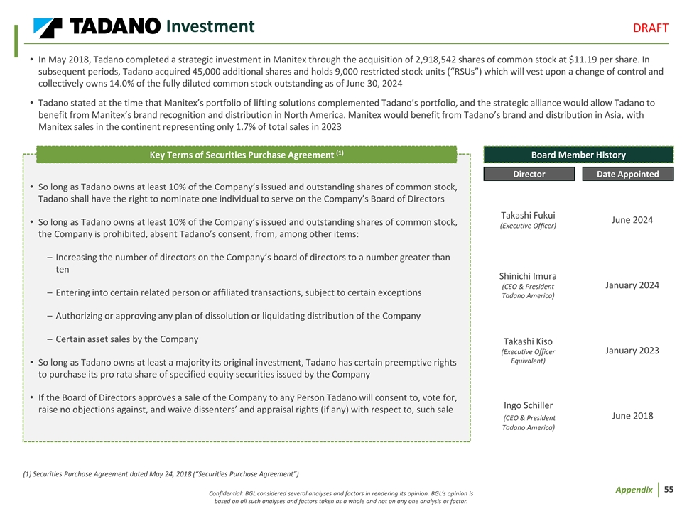 投资草案• 2018年5月,Tadano通过以每股11.19美元的价格收购291.8542万股普通股,完成了对Manitex的战略投资。在随后的期间,Tadano获得了45,000股额外股份,并持有9,000个限制性股票单位(“RSU”),这些单位将在控制权发生变化时归属,并共同拥有截至2024年6月30日已发行完全稀释普通股的14.0% • Tadano当时表示,Manitex的起重解决方案组合补充了Tadano的组合,战略联盟将使Tadano受益于Manitex在北美的品牌认知度和分销。Manitex将受益于Tadano在亚洲的品牌和分销,2023年Manitex在该大陆的销售额仅占总销售额的1.7%(1)证券购买协议关键条款董事会成员历史董事任命日期•只要Tadano拥有至少10%的公司已发行和已发行普通股,Tadano将有权提名一人担任公司董事会成员Takashi Fukui 2024年6月•只要Tadano拥有至少10%的公司已发行和已发行普通股,(执行官)未经Tadano同意,公司被禁止参与,除其他事项外:–将公司董事会的董事人数增加到十人以上井村真一(CEO兼总裁2024年1月–进行某些关联人或关联交易,但Tadano America除外)–授权或批准公司的任何解散或清算分配计划–公司Takashi Kiso(执行官2023年1月相当)的某些资产出售•只要Tadano至少拥有其原始投资的多数,Tadano拥有购买其按比例份额的公司发行的特定股本证券的某些优先购买权•如果董事会批准向任何人出售公司,Tadano将同意、投票支持、Ingo Schiller不提出反对意见,并放弃异议者和评估权(如有),该出售于2018年6月(CEO兼总裁Tadano America)(1)日期为2018年5月24日的证券购买协议(“证券购买协议”)55附录机密:BGLL在发表意见时考虑了几项分析和因素。BGL的意见是基于所有这些分析和因素作为一个整体,而不是基于任何一个分析或因素。