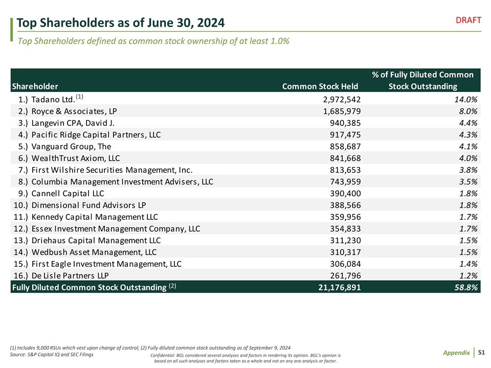 截至2024年6月30日的最大股东草案最大股东定义为普通股所有权至少为完全稀释后普通股股东普通股的1.0% %持有流通股(1)1.)Tadano Ltd. 2,972,54214.0% 2.)Royce & Associates,LP 1,685,9798.0% 3.)Langevin CPA,David J. 940,3854.4% 4.)Pacific Ridge Capital Partners,LLC 917,4754.3% 5.)Vanguard Group,the 858,6874.1% 6.)WealthTrust Axiom,LLC 841,6684.0% 7.)First Wilshire Securities Management,Inc. 813,6533.8% 8.)COLUMBIA MANAGEMENT投资顾问,LLC 743,9593.5% 9.)Cannell Capital LLC 390,4001.8% 10.)Dimensional Fund Advisors LP 388,5661.8% 11.)Kennedy Capital Management LLC 359,9561.7% 12.)Essex Investment Management Company,LLC 354,8331.7% 13.)Driehaus Capital Management LLC 311,2301.5% 14.)Wedbush Asset Management,LLC 310,3171.5% 15.)First Eagle Investment Management,LLC 306,0841.4% 16.)De Lisle Partners LLP 261,7961.2%(2)完全稀释的已发行普通股21,176,89158.8%(1)包括在控制权变更时归属的9,000个RSU;(2)截至9月9日已发行完全稀释的普通股,202451附录来源:标普 Capital IQ和SEC文件机密:BGL在发表意见时考虑了几项分析和因素。BGL的意见是基于所有这些分析和因素作为一个整体,而不是基于任何一个分析或因素。