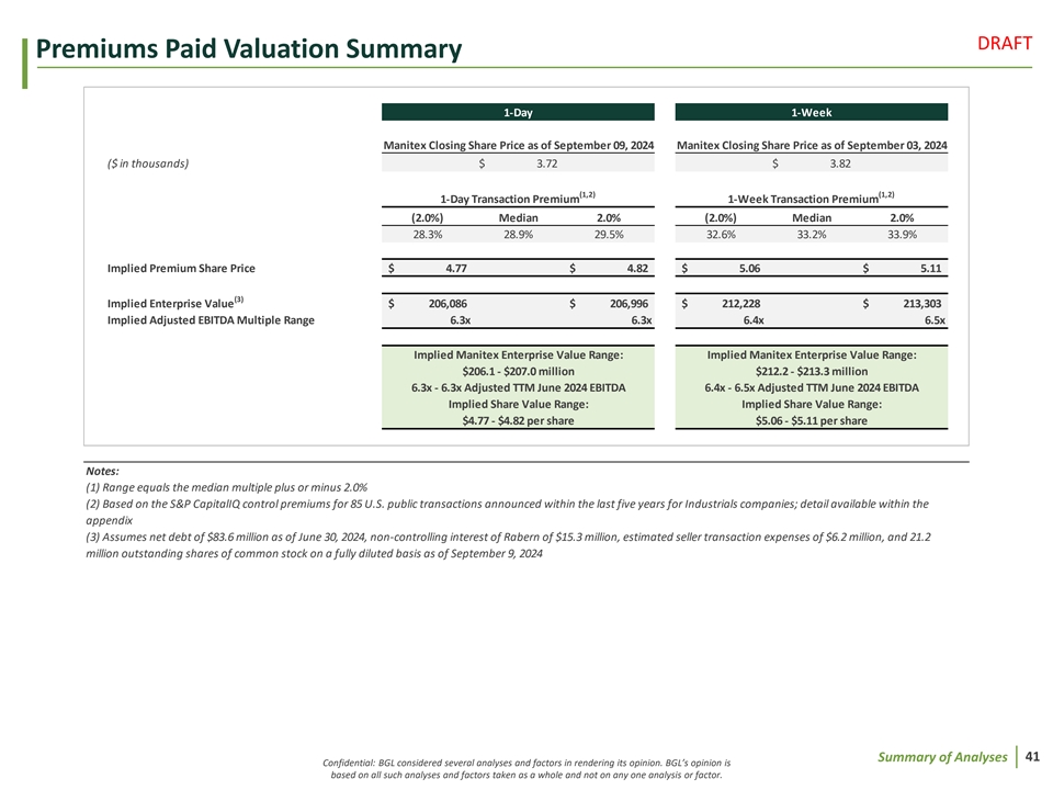 可比先例交易草案–零部件估值摘要之和可比先例OEM交易可比先例租赁交易(1)(1)EV与TTM EBITDA倍数区间中值EV与TTM EBITDA倍数区间中值(单位:千美元)(2.0%)中值2.0%(2.0%)中值2.0% 6.9x 7.0x 7.2x 6.1x 6.5x 6.8x TTM 2024年6月归属于OEM业务的EBITDA TTM 2024年6月归属于租赁业务的EBITDA 21,419美元11,546%归属于OEM业务的EBITDA %归属于租赁业务的EBITDA 65.0% 35.0% OEM业务隐含EV隐含租赁业务EV $ 147,348 $ 153,362 $ 70,76678,215美元隐含企业价值范围隐含EV区间前(折价)/溢价218,114美元231,577美元(2)可比性折价(7.6%)(7.6%)总(折价)/溢价(7.6%)(7.6%)隐含企业价值201,450美元213,884美元(3)每股隐含价值4.55美元5.14美元隐含调整后EBITDA倍数区间6.1x 6.5x隐含Manitex企业价值区间:201.4美元-2.139亿美元6.1x-6.5x调整后TTM 2024年6月EBITDA隐含股份价值区间:每股4.55美元-5.14美元注:(1)区间等于中位倍数正负2.0%(2)市值十分位数10B的公司的规模溢价,每研究中心证券价格十分位大小数据(数据截至12/2023)(3)假设截至2024年6月30日的净债务为8360万美元,Rabern的非控股权益为1530万美元,估计卖方交易费用为620万美元,截至2024年9月9日在完全稀释的基础上已发行普通股为2120万股40分析摘要机密:BGL在发表意见时考虑了几项分析和因素。BGL的意见是基于所有这些分析和因素作为一个整体,而不是基于任何一个分析或因素。