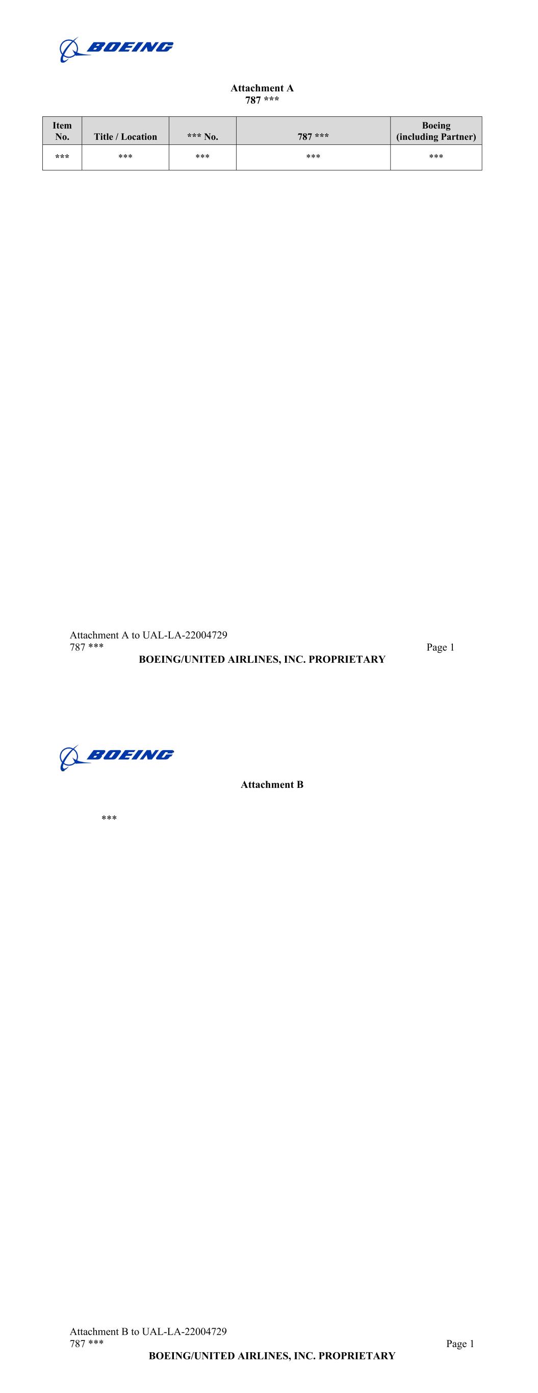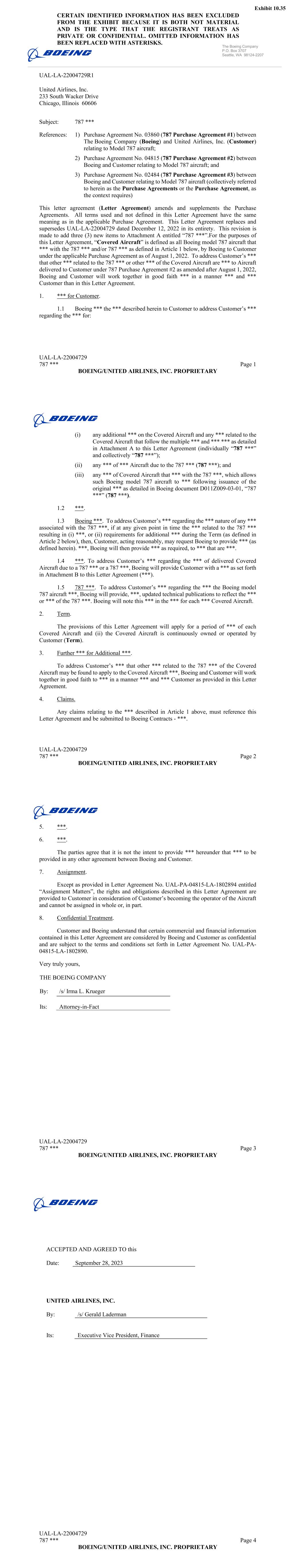 某些已识别的信息已被排除在展览之外,因为它既不是材料,也是注册人视为私人或机密的类型。OMITTED INFORMATION has been replaced with ASTERISKS。UAL-LA-22004729 787 * * *第1页BOEING/UNITED AIRLINES,INC。产权The Boeing Company P.O. Box 3707 Seattle,WA 98124-2207 UAL-LA-22004729R1 United Airlines,Inc. 233 South Wacker Drive Chicago,Illinois 60606标的:787 * * *参考资料:1)The Boeing Company(Boeing)与United Airlines,Inc.(Customer)之间关于787飞机的第03860号采购协议(787采购协议# 1);2)波音与Customer之间关于787飞机的第04815号采购协议(787采购协议# 2);3)波音与Customer之间关于787飞机的第02484号采购协议(787采购协议# 3)(统称为采购协议或采购协议,根据上下文的要求)本信函协议(Letter Agreement)对采购协议进行了修订和补充。本函协议中使用和未定义的所有术语与适用的采购协议中的含义相同。本信函协议全部取代并取代2022年12月12日的UAL-LA-22004729。此次修订是为了在附件A中添加三(3)项新内容,标题为“787 * * *”。就本信函协议而言,“涵盖飞机”的定义是,自2022年8月1日起,波音公司根据适用的采购协议向客户提供的所有波音787型号飞机* * *与下文第1条中定义的787 * * *和/或787 * * *一起。为解决客户的* * *,与所涵盖的飞机的787 * * *或其他* * *有关的其他* * *是根据2022年8月1日后修订的787购买协议# 2交付给客户的飞机,波音和客户将本着诚信* * *的精神* * *合作,方式* * *和* * *客户,而不是在本信协议中。1.* * *客户。1.1波音公司* * *此处向客户描述的* * *是为了回应客户的* * *关于* *的* * *:附件 10.35 UAL-LA-22004729 787 * * *第2页BOEING/UNITED AIRLINES,INC。产权(i)受保护飞机上的任何额外* * *,以及与受保护飞机有关的任何* * *,如本函件协议附件A所详述的复数* * *和* * * * * *(单列为“787 * * *”,统称为“787 * * *”);(ii)因787 * * *(787 * * *)而产生的任何* * *飞机;及(iii)因787 * * *而产生的任何* * *受保护飞机上的任何* * *,这允许该波音787型号飞机在波音D011Z009-03-01,“787 * * *”(787 * * * *)文件中详述的原始* * *签发后* * * * * * * * * * * * * * * * * * * * * * * * * * * * * * * * * *1.2 ***.1.3波音* * *。为了解决客户对与787 * * * *相关的任何* * *的* * *性质的* * *,如果在任何给定的时间点,与787 * * *相关的* * *导致(i)* * *,或(ii)在期限内(定义见下文第2条)对额外* * *的要求,那么,客户在合理行事的情况下,可以要求波音提供* * *(定义见下文)。* * *后,波音将按要求向* * *提供* *,即* * *。1.4 ***.为解决客户对因一架787 * * *或一架787 * * *而交付的已覆盖飞机的* * *的问题,波音公司将向客户提供本信函协议(* * *)附件B所列的* * *。1.5 787 ***.为了解决客户对波音787机型* * * *的* * *,波音将提供* * *更新的技术出版物,以反映787 * * * *的* * *或* * *。波音公司将在每架被覆盖的* * *飞机的* * *中注明这一* * *。2.学期。本函件协议的规定将适用于每架被覆盖飞机的* * *期限,并且(ii)被覆盖飞机由客户持续拥有或运营(期限)。3.进一步* * *为补充* * *。为了解决客户的* * *,与被覆盖飞机的787 * * *有关的其他* * *可能被发现适用于被覆盖飞机* * *,波音公司和客户公司将本着诚意,按照本信函协议的规定,以* * *和* * *的方式向* * *客户合作。4.索赔。与上文第1条所述的* * *有关的任何索赔,必须参照本信函协议并提交给波音合同-* * *。UAL-LA-22004729 787 * * *第3页波音/联合航空公司。产权5。***.6.***.双方同意,波音与客户之间的任何其他协议中提供的* * *并不是根据本协议提供* * *的意图。7.分配。但编号为信函协议的规定除外。题为“转让事项”的UAL-PA-04815-LA-1802894,本信函协议中所述的权利和义务是考虑到客户成为飞机的运营者而提供给客户的,不能全部转让或转让, 部分。8.保密治疗。客户和波音公司理解,本信函协议中包含的某些商业和财务信息被波音和客户视为机密信息,并受第UAL-PA-04815-LA-1802890。非常诚挚,波音公司作者:/s/Irma L. Krueger Its:Attorney-in-Fact UAL-LA-22004729 787 * * * Page 4 BOEING/UNITED AIRLINES,INC。截止日期:2023年9月28日UNITED AIRLINES,INC。作者:/s/Gerald Laderman其财务执行副总裁
