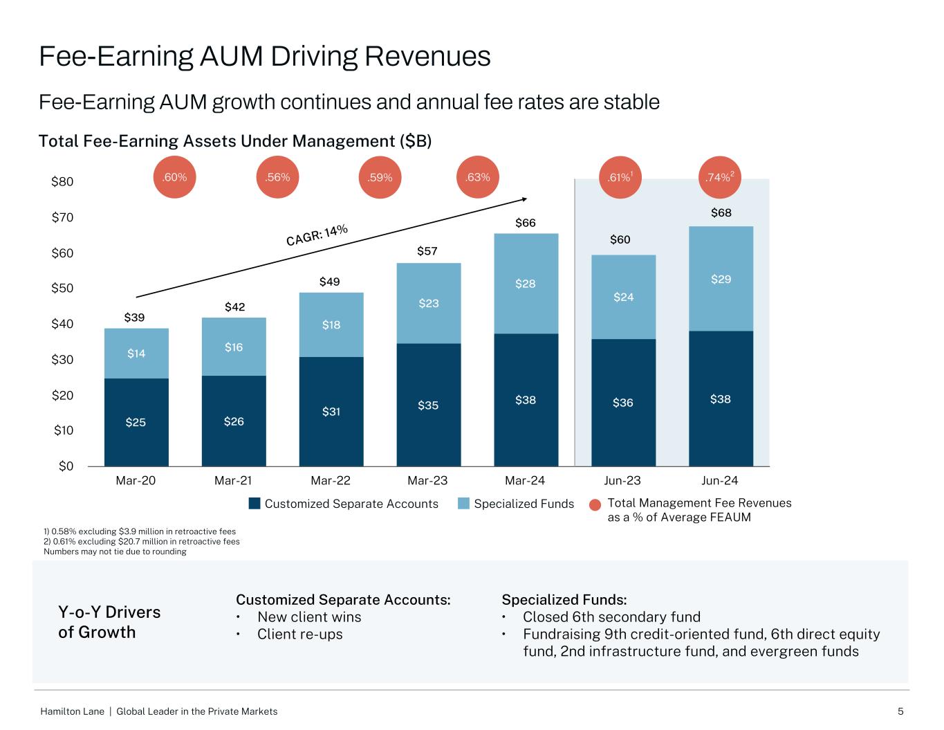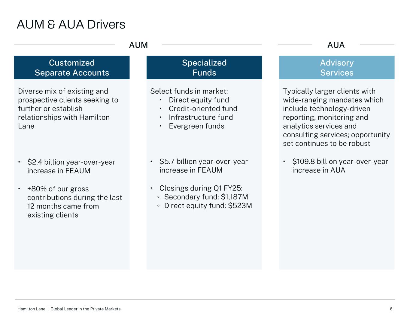 5Hamilton Lane |私人市场全球领导者增长的同比驱动因素管理下的总收费资产($ B)$ 25 $ 26 $ 31 $ 35 $ 38 $ 36 $ 38 $ 14 $ 16 $ 18 $ 23 $ 28 $ 24 $ 29定制独立账户专门基金Mar-20 Mar-21 Mar-22 Mar-23 Mar-24 Jun-23 Jun-24 $ 0 $ 10 $ 20 $ 30 $ 40 $ 50 $ 60 $ 70 $ 80收费AUM增长持续年费率稳定CAGR:14% 1)0.58%,不包括390万美元的追溯费用2)0.61%,不包括2070万美元的追溯费用数字,由于总管理费收入占平均FEAUM定制独立账户的百分比四舍五入,可能不会打平:•新客户赢得•客户重新启动专业基金:•封闭式第6只二级基金•募集第9只信贷导向基金、第6只直接股票基金、第2只基础设施基金、常青基金。60% $ 42 $ 60 $ 57 $ 39 $ 49 $ 68收费AUM驱动收入.56%.59%.63%.61% 1.74% 2 $ 66