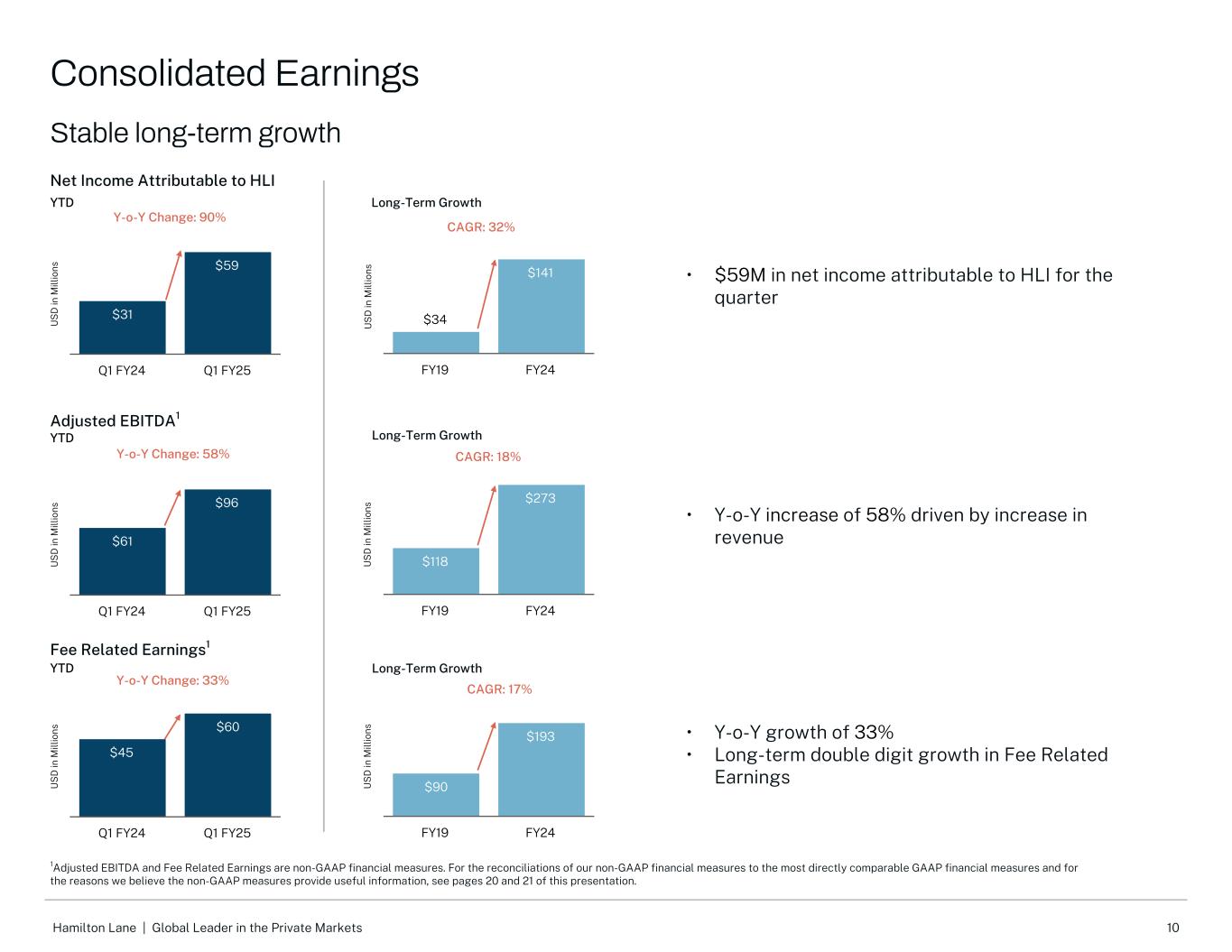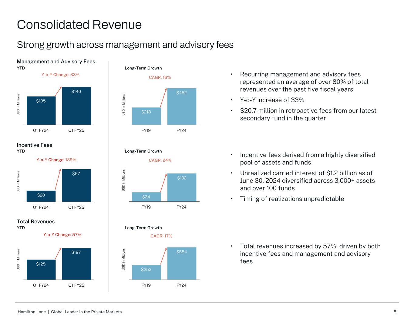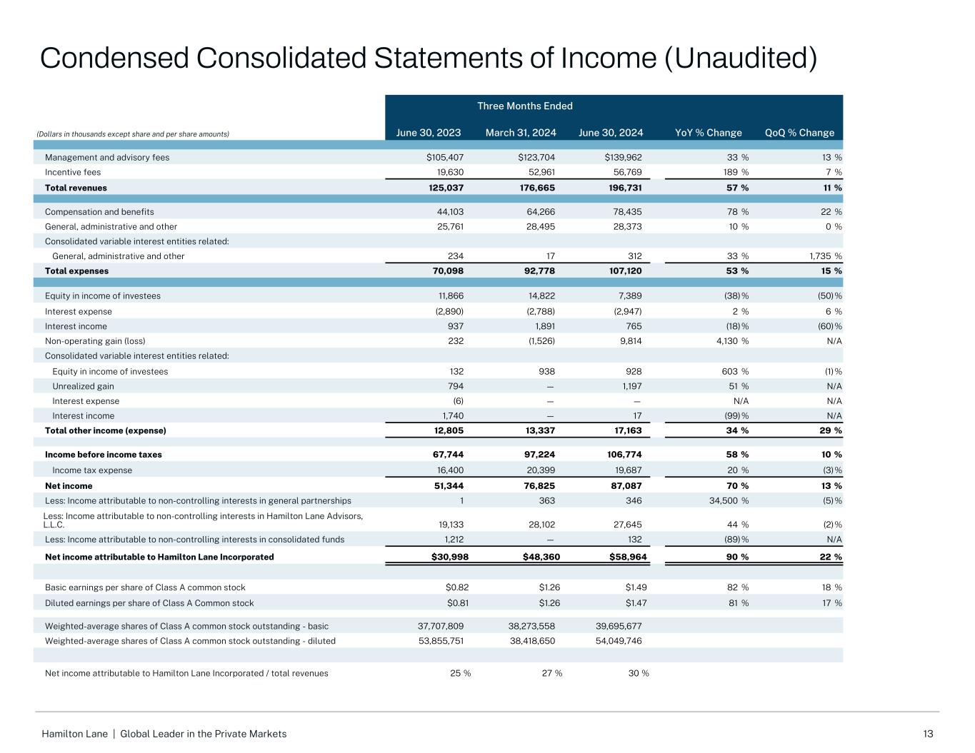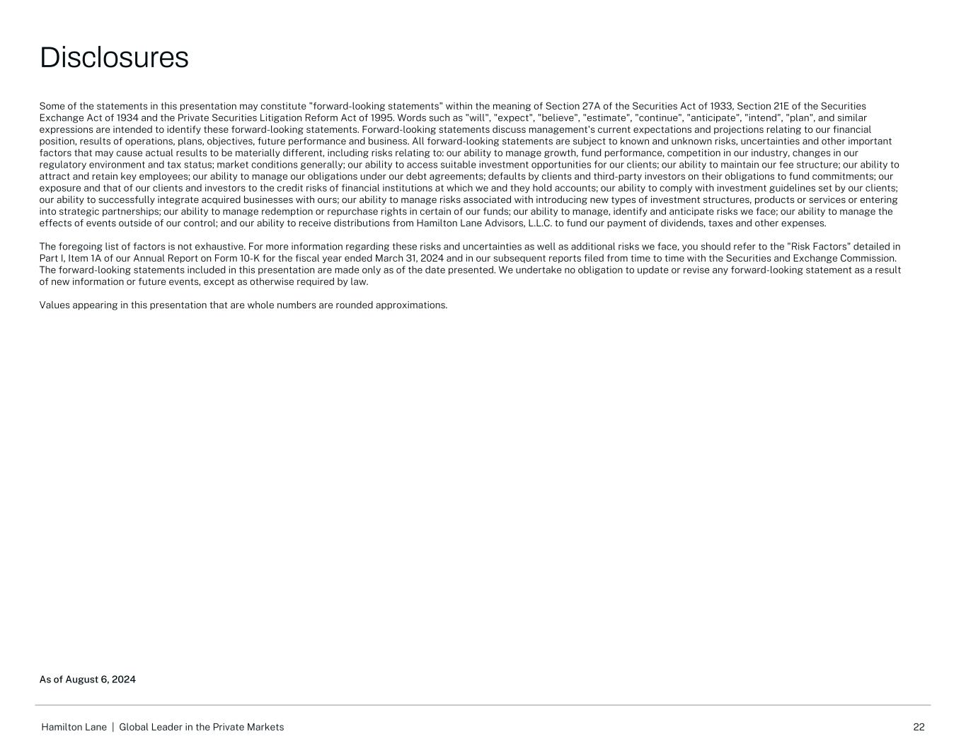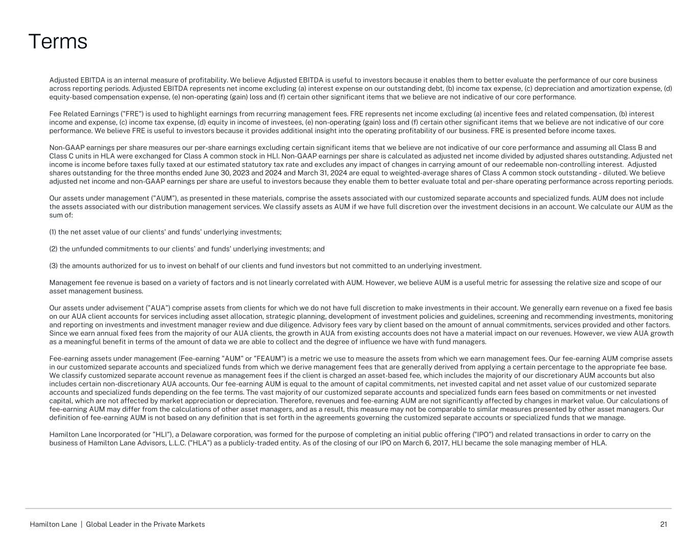 21Hamilton Lane |私人市场的全球领导者调整后EBITDA是衡量盈利能力的内部衡量标准。我们认为调整后的EBITDA对投资者有用,因为它使他们能够更好地评估我们核心业务在报告期内的表现。调整后EBITDA指不包括(a)我们未偿债务的利息费用、(b)所得税费用、(c)折旧和摊销费用、(d)基于股权的补偿费用、(e)非经营性(收益)损失和(f)我们认为不代表我们核心业绩的某些其他重要项目的净收入。费用相关收益(“FRE”)用于突出显示经常性管理费的收益。FRE代表不包括(a)激励费用和相关薪酬、(b)利息收入和费用、(c)所得税费用、(d)被投资方收益中的权益、(e)非经营性(收益)损失和(f)我们认为不代表我们核心业绩的某些其他重要项目的净收入。我们认为FRE对投资者是有用的,因为它为我们业务的运营盈利能力提供了额外的洞察力。FRE在所得税前列报。非GAAP每股收益衡量的是我们的每股收益,不包括我们认为不代表我们核心业绩的某些重要项目,并假设HLA中的所有B类和C类单位都被交换为HLI中的A类普通股。非GAAP每股收益的计算方法是调整后的净收入除以调整后的流通股。调整后的净收入是按我们估计的法定税率全额征税的税前收入,不包括我们可赎回非控股权益账面金额变化的任何影响。截至2023年6月30日和2024年6月30日止三个月以及2024年3月31日止三个月的调整后流通股等于已发行A类普通股的加权平均股数-稀释后。我们认为,调整后的净收入和非GAAP每股收益对投资者有用,因为它们使他们能够更好地评估报告期间的总经营业绩和每股经营业绩。如这些材料所示,我们管理下的资产(“AUM”)包括与我们定制的独立账户和专门基金相关的资产。AUM不包括与我们的分销管理服务相关的资产。如果我们对账户中的投资决策拥有充分的自由裁量权,我们就会将资产归类为AUM。我们将AUM计算为:(1)我们的客户和基金的基础投资的资产净值;(2)对我们的客户和基金的基础投资的无资金承诺;以及(3)授权我们代表我们的客户和基金投资者进行投资但未承诺进行基础投资的金额之和。管理费收入基于多种因素,与AUM不呈线性相关。然而,我们认为AUM是评估我们资产管理业务的相对规模和范围的有用指标。我们的顾问资产(“AUA”)包括来自客户的资产,我们没有充分的酌处权在他们的账户上进行投资。我们通常在AUA客户账户上以固定费用赚取收入,服务包括资产配置、战略规划、制定投资政策和指导方针、筛选和推荐投资、监测和报告投资以及投资经理审查和尽职调查。咨询费因客户而异,具体取决于年度承诺金额、提供的服务和其他因素。由于我们从大多数AUA客户那里赚取年度固定费用,现有账户的AUA增长不会对我们的收入产生实质性影响。然而,就我们能够收集的数据量以及我们对基金经理的影响程度而言,我们认为AUA增长是一个有意义的好处。管理下的收费资产(收费的“AUM”或“FEAUM”)是我们用来衡量我们从中赚取管理费的资产的一个指标。我们的收费AUM包括我们定制的独立账户中的资产和我们从中获得管理费的专门基金,这些费用通常是通过在适当的收费基础上应用一定百分比而得出的。如果向客户收取基于资产的费用,我们将定制的独立账户收入归类为管理费,这包括我们的大部分全权AUM账户,但也包括某些非全权AUA账户。我们的收费AUM等于我们定制的独立账户和专门基金的资本承诺金额、净投资资本和资产净值,具体取决于收费条款。我们定制的绝大多数独立账户和专门基金都是根据承诺或净投入资本赚取费用,不受市场升值或贬值的影响。因此, 营收和收费AUM受市值变化影响不大。我们对收费AUM的计算可能与其他资产管理公司的计算有所不同,因此,这一衡量标准可能无法与其他资产管理公司提出的类似衡量标准进行比较。我们对收费AUM的定义不是基于管理我们管理的定制独立账户或专门基金的协议中规定的任何定义。Hamilton Lane Incorporated(或“HLI”),一家特拉华州公司,为完成首次公开发行股票(“IPO”)及相关交易的目的,以开展Hamilton Lane Advisors,L.L.C.(“HLA”)作为公开交易实体的业务而成立。截至2017年3月6日我们的首次公开募股结束时,HLI成为HLA的唯一管理成员。条款