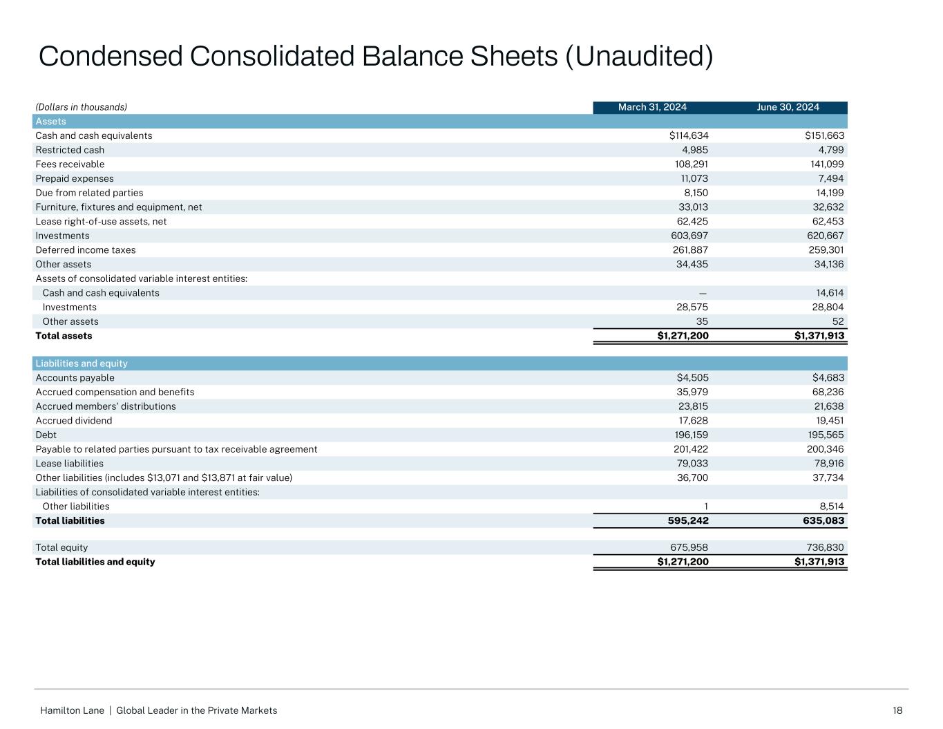 18Hamilton Lane |全球私人市场领导者(千美元)2024年3月31日2024年6月30日资产现金和现金等价物$ 114,634 $ 151,663受限制现金4,9854,799应收费用108,291141,099预付费用11,0737,494应收关联方款项8,15014,199家具、固定装置和设备净额33,01332,632租赁使用权资产,净额62,42562,453投资603,697620,667递延所得税261,887259,301其他资产34,43534,136合并可变利益实体的资产:现金和现金等价物— 14,614投资28,57528,804其他资产3552总资产1,271,200美元1,371,913美元负债和权益应付账款4,505美元4,683美元应计薪酬和福利35,97968,236应计成员分配23,81521,638应计股息17,62819,451债务196,159195,565根据应收税款协议应付关联方201,422200,346租赁负债79,03378,916其他负债(包括13,071美元和按公允价值计算的13,871美元)36,70037,734合并可变利益实体的负债:其他负债18,514负债总额595,242635,083总权益675,958736,830 总负债及权益 $ 1,271,200 $ 1,371,913简明合并资产负债表(未经审计)