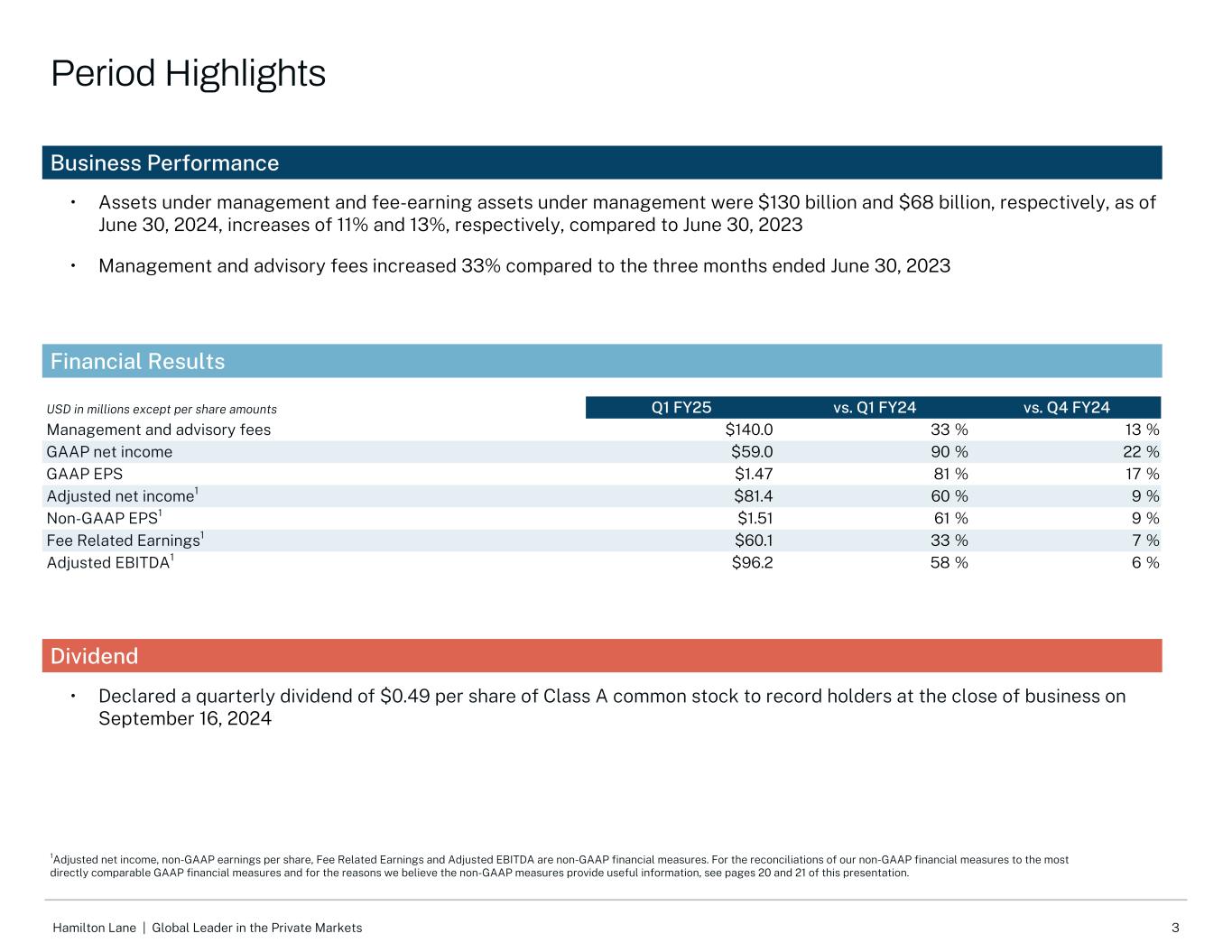 3汉密尔顿车道|全球领先的私人市场业务业绩财务业绩股息•截至2024年6月30日,管理资产和管理收费资产分别为1300亿美元和680亿美元,与2023年6月30日相比分别增长11%和13% •管理和咨询费用与截至6月30日的三个月相比增长33%,2023美元(百万美元),每股金额除外Q1 FY25 vs Q1 FY24 vs Q4 FY24管理和咨询费140.033% 13% GAAP净收入$ 59.090% 22% GAAP EPS $ 1.4781% 17%调整后净收入1 $ 81.460% 9% Non-GAAP EPS1 $ 1.5161% 9%费用相关收益1 $ 60.133% 7%调整后EBITDA 1 $ 96.258% 6% •宣布在2024年9月16日营业结束时向记录持有人派发每股A类普通股0.49美元的季度股息1调整后净收入,非GAAP每股收益、与费用相关的收益和调整后EBITDA是非GAAP财务指标。关于我们的非GAAP财务指标与最直接可比的GAAP财务指标的对账,以及出于我们认为非GAAP指标提供有用信息的原因,请参阅本演示文稿的第20和21页。期间亮点