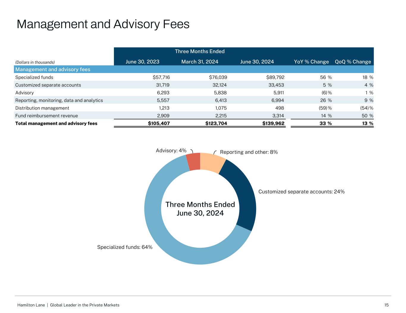 14Hamilton Lane |私人市场的全球领导者1调整后EBITDA和非GAAP每股收益为非GAAP财务指标。有关我们的非GAAP财务指标与最直接可比的GAAP财务指标的对账,请参见第20页。2激励费相关补偿包括激励费补偿费用和与附带权益相关的奖金被归类为基数补偿。3代表按我们估计的截至2024年6月30日和2023年6月30日止三个月期间的法定税率分别为23.4%和23.6%的公司所得税,适用于调整后的税前净收入。这23.4%是基于21.0%的联邦税收法定税率和2.4%的扣除联邦福利的合并州所得税税率。这23.6%是基于21.0%的联邦税收法定税率和2.6%的扣除联邦福利的合并州所得税税率。截至三个月(除股份和每股金额外,以千美元计)2023年6月30日2024年3月31日2024年6月30日YoY % Change QoQ % Change Adjusted EBITDA1 Management and Advisory Fees $ 105,407 $ 123,704 $ 139,96233% 13% Revenue related to Consolidated Funds 147 ——(100)% N/A Total expenses 70,09892,778107,12053% 15% less:N/A N/A Incentive Fee related compensation2(9,324)(25,157)(26,965)189% 7% Consolidated VIE related general,行政及其他费用(233)—(312)34% N/A营业外收入相关补偿(59)—— N/A N/A管理费相关费用60,48267,62179,84332% 18%费用相关收益$ 45,072 $ 56,083 $ 60,11933% 7%费用相关利润率43% 45% 43%激励费用19,63052,96156,769189% 7%非控股权益应占激励费用———— N/A N/A激励费用相关补偿2(9,324)(25,157)(26,965)189% 7%营业外收入相关补偿(59)—— N/A N/A利息收入9371,891765(18)%(60)%股权激励2,8462,9063,22313% 11%折旧和摊销1,8732,4112,31323%(4)%调整后EBITDA 60,975美元91,095美元96,22458% 6%调整后EBITDA利润率49% 52% 49%非公认会计准则每股收益1归属于Hamilton Lane Incorporated的净利润30,998美元48,360美元58,96490% 22%收入归属于Hamilton Lane顾问公司的非控股权益,有限责任公司19,13328,10227,64544%(2)%所得税费用16,40020,39919,68720%(3)%调整后税前净收入66,53196,861106,29660% 10%调整后所得税3(15,701)(22,306)(24,873)58% 12%调整后净收入50,830美元74,555美元81,42360% 9%调整后流通股53,855,75153,994,74654,049,746非公认会计原则每股收益0.94美元1.38美元1.5 161% 9%非公认会计原则财务措施