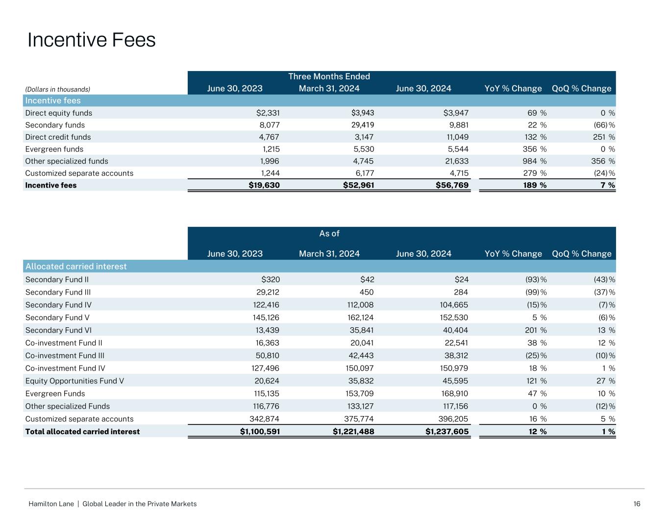 15Hamilton Lane |私人市场的全球领导者三个月结束(千美元)2023年6月30日2024年3月31日2024年6月30日YoY %变化QoQ %变化管理和咨询费专项基金$ 57,716 $ 76,039 $ 89,79256% 18%定制独立账户31,71932,12433,4535% 4%咨询6,2935,8385,911(6)% 1%报告、监测、数据和分析5,5576,4136,99426% 9%分销管理1,2131,075498(59)%(54)%基金报销收入2,9092,2153,31414% 50%管理和咨询费总额105,407美元123,704美元139,96233% 13%报告和其他:8%定制独立账户:24%专门基金:64%咨询:4%截至2024年6月30日的三个月管理和咨询费