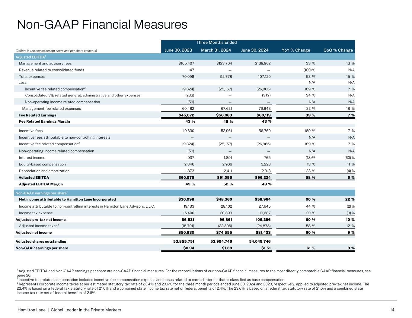 13Hamilton Lane |全球私募市场领导者简明合并损益表(未经审计)截至三个月(除股份和每股金额外,以千美元计)2023年6月30日2024年3月31日2024年6月30日同比%变化环比百分比变化管理和咨询费105,407美元123,704美元139,96233% 13%奖励费19,63052,96156,769189% 7%总收入125,037176,665196,73157% 11%薪酬和福利44,10364,26678,43578% 22%一般、行政和其他25,76128,49528,37310% 0%合并可变利益实体相关:一般,行政及其他2341731233% 1,735%费用总额70,09892,778107,12053% 15%被投资单位收益中的权益11,86614,8227,389(38)%(50)%利息支出(2,890)(2,788)(2,947)2% 6%利息收入9371,891765(18)%(60)%营业外收益(亏损)232(1,526)9,8144,130%不适用合并可变利益实体相关:被投资单位收益中的权益132938928603%(1)%未实现收益794 — 1,19751%不适用利息支出(6)——不适用不适用利息收入1,740 — 17(99)%不适用其他收入合计(费用)12,80513,33717,16334% 29%所得税前收入67,74497,224106,77458% 10%所得税费用16,40020,39919,68720%(3)%净收入51,34476,82587,08770% 13%减:归属于普通合伙企业非控股权益的收益136334634,5%减:归属于Hamilton Lane顾问公司非控股权益的收益,有限责任公司19,13328,10227,64544%(2)%减:归属于合并基金非控股权益的收益1,212 — 132(89)% N/A归属于Hamilton Lane Incorporated的净利润$ 30,998 $ 48,360 $ 58,96490% 22% A类普通股每股基本收益$ 0.82 $ 1.26 $ 1.4982% 18% A类普通股稀释后每股收益$ 0.81 $ 1.26 $ 1.4781% 17% A类普通股加权平均流通股-基本37,707,80938,273,55839,695,677 A类普通股加权平均流通股-稀释后53,855,75138,418,65054,049,746归属于汉密尔顿的净利润Lane Incorporated/总收入25% 27% 30%