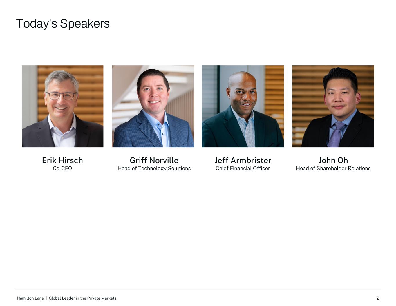 2 Hamilton Lane |私人市场的全球领导者Griff Norville技术解决方案主管今日演讲Erik Hirsch联合首席执行官Jeff Armbrister 首席财务官 John Oh股东关系主管
