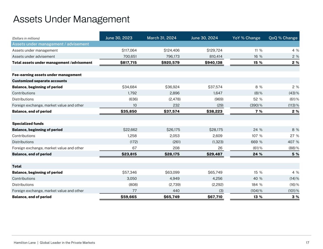 16Hamilton Lane |私人市场的全球领导者三个月结束(千美元)2023年6月30日2024年3月31日6月30日,2024年同比%变化QoQ %变化激励费用直接股权基金$ 2,331 $ 3,943 $ 3,94769% 0%二级基金8,07729,4199,88122%(66)%直接信贷基金4,7673,14711,049132% 251%长青基金1,2155,5305,544356% 0%其他专项基金1,9964,74521,633984% 356%定制独立账户1,2446,1774,715279%(24)%激励费用$ 19,630 $ 52,961 $ 56,769189% 7%截至2023年6月30日2024年3月31日6月30日,2024年同比%变动QoQ %变动分配附带权益二级基金II $ 320 $ 42 $ 24(93)%(43)%二级基金III 29,212450284(99)%(37)%二级基金IV 122,416112,008104,665(15)%(7)%二级基金V 145,126162,124152,5305%(6)%二级基金VI 13,43935,84140,404201% 13%共同投资基金II 16,36320,04122,54138% 12%共同投资基金III 50,81042,44338,312(25)%(10)%共同投资基金IV 127,496150,097150,97918% 1%股权机会基金V 20,62435,83245,595121% 27%长青基金115,135153,709168,91047% 10%其他专门基金116,776133,127117,1560%(12)%定制独立账户342,874375,774396,20516% 5%分配的附带权益总额$ 1,100,591 $ 1,221,488 $ 1,237,60512% 1%激励费用