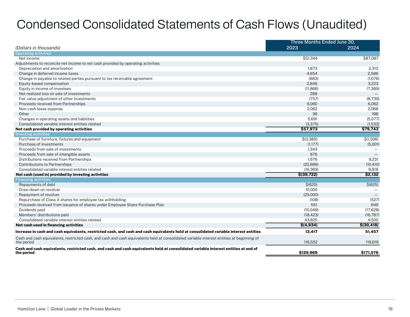 19Hamilton Lane |私人市场的全球领导者,截至6月30日的三个月,(千美元)20232024年经营活动净收入51,344美元87,087美元调整净收入与经营活动提供的净现金:折旧和摊销1,8732,313递延所得税变化4,6542,586根据应收税款协议应付关联方的变化(883)(1,076)股权补偿2,8463,223被投资单位收益权益(11,866)(7,389)出售投资实现净亏损288 —其他投资的公允价值调整(757)(8,739)从合伙企业收到的收益6,0606,062非现金租赁费用2,0622,088其他36198经营资产变动和负债5,691(5,077)合并可变利益实体相关(3,375)(1,533)经营活动提供的现金净额57,973美元79,743美元投资活动购买家具,夹具和设备$(3,385)$(1,506)购买投资(1,177)(5,001)出售投资收益1,343 —出售无形资产收益876 —从合伙企业收到的分配款1,6769,231对合伙企业的捐款(22,686)(10,410)合并可变利益实体相关(16,369)9,818投资活动提供的现金净额(用于)$(39,722)$ 2,132融资活动偿还债务$(625)$(625)左轮手枪提款10,000 —左轮手枪还款(25,000)—回购A类股用于员工预扣税款(108)(527)根据员工股份购买计划发行股份收到的收益551649支付的股息(15,049)(17,628)支付的会员分配(18,423)(16,787)与合并可变利益实体相关的43,8204,500用于筹资活动的现金净额$(4,834)$(30,418)增加在合并可变利益实体持有的现金和现金等价物、限制性现金、现金和现金等价物13,41751,457期初在合并可变利益实体持有的现金和现金等价物、限制性现金、现金和现金等价物116,552119,619现金和现金等价物、限制性现金,期末合并可变利益实体持有的现金和现金等价物129,969美元171,076美元简明合并现金流量表(未经审计)