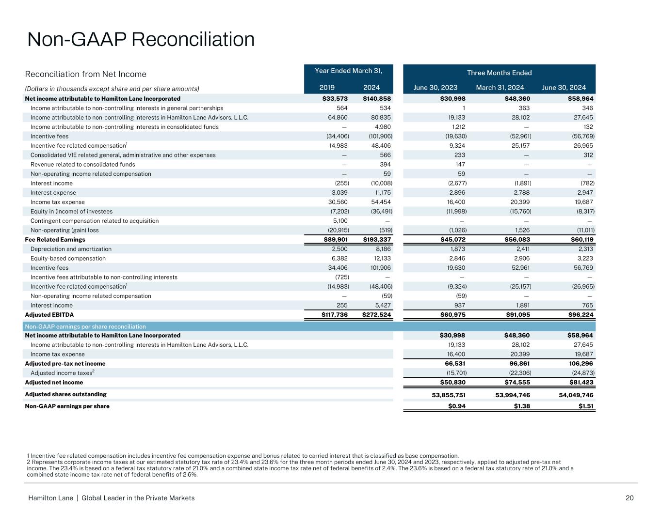 20Hamilton Lane |私人市场全球领导者净收入对账截至3月31日止年度、三个月止(除股份和每股金额外,单位:千美元)201920242023年6月30日2024年3月31日2024年6月30日归属于Hamilton Lane Incorporated的净利润33,573美元140,858美元30,998美元48,360美元58,964美元归属于普通合伙企业非控股权益的收入5645341363346归属于Hamilton Lane顾问公司非控股权益的收入,有限责任公司64,86080,83519,13328,10227,645合并基金非控股权益应占收益— 4,9801,212 — 132激励费用(34,406)(101,906)(19,630)(52,961)(56,769)激励费用相关补偿114,98348,4069,32425,15726,965合并VIE相关一般,行政及其他费用— 566233 — 312与合并基金相关的收入— 394147 ——与营业外收入相关的补偿— 5959 ——利息收入(255)(10,008)(2,677)(1,891)(782)利息支出3,03911,1752,8962,7882,947所得税费用30,56054,45416,40020,39919,687被投资单位权益(收益)(7,202)(36,491)(11,998)(15,760)(8,317)与收购相关的或有补偿5,100 ————营业外(收益)损失(20,915)(519)(1,026)1,526(11,011)与费用相关的收益$ 89,901 $ 193,337及摊销2,5008,1861,8732,4112,313股权报酬6,38212,1332,8462,9063,223激励费用34,406101,90619,63052,96156,769归属于非控股权益的激励费用(725)————激励费用相关报酬1(14,983)(48,406)(9,324)(25,157)(26,965)营业外收入相关报酬——(59)——利息收入2555,4279371,891765调整后EBITDA 117,736美元272,524美元60,975美元91,095美元96,224美元非公认会计准则每股收益调节归属于Hamilton Lane Incorporated的净利润30,998美元48,360美元58,964归属于Hamilton Lane顾问公司非控股权益的收入,有限责任公司19,13328,10227,645所得税费用16,40020,39919,687调整后税前净收入66,53196,861106,296调整后所得税2(15,701)(22,306)(24,873)调整后净收入$ 50,830 $ 74,555 $ 81,423调整后流通股53,855,75153,994,74654,049,746非公认会计原则每股收益0.94美元1.38美元1.51美元1与激励费用相关的薪酬包括激励费用薪酬费用和与附带权益相关的奖金,归类为基本薪酬。2代表按我们估计的截至2024年6月30日和2023年6月30日止三个月期间的法定税率分别为23.4%和23.6%的公司所得税,适用于调整后的税前净收入。这23.4%是基于21.0%的联邦税收法定税率和2.4%的扣除联邦福利的合并州所得税税率。这23.6%是基于21.0%的联邦税收法定税率和2.6%的扣除联邦福利的合并州所得税税率。非公认会计原则和解