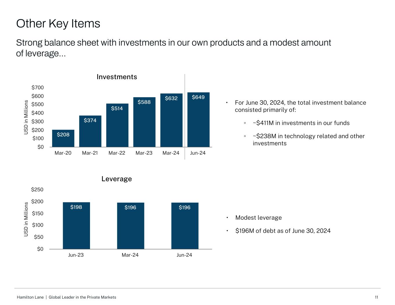 11Hamilton Lane |私人市场全球领导者US D in M ill io ns Investments $ 208 $ 374 $ 514 $ 588 $ 632 $ 649 Mar-20 Mar-21 Mar-22 Mar-23 Mar-24 Jun-24 $ 0 $ 100 $ 200 $ 300 $ 400 $ 500 $ 600 $ 700 •对于2024年6月30日,总投资余额主要包括:⑤~4.11亿美元对我们基金的投资⑤~2.38亿美元对技术相关和其他投资•适度杠杆•截至6月30日的债务为1.96亿美元,2024年M病O NS杠杆198美元196美元196美元6月23日3月24日6月24日0美元50美元100美元150美元200美元250美元其他关键项目强劲的资产负债表,投资于我们自己的产品和适度的杠杆..。
