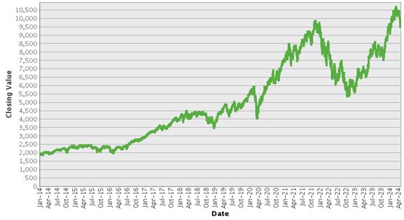 下图显示的是标普 500指数的收盘价®2014年1月2日至2024年4月25日期间,每天都有此类数值的索引。我们从Bloomberg L.P.获得了收盘数值,未经独立验证。你不应该把历史收盘数值作为未来表现的指标。