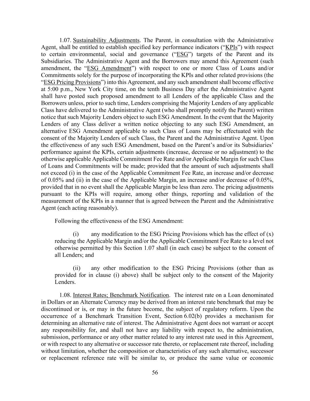 56 1.07.可持续性调整。母公司经与行政代理人协商,有权就母公司及其子公司的某些环境、社会和治理(“ESG”)目标建立特定的关键绩效指标(“KPI”)。行政代理人和借款人可以仅为将KPI和其他相关条款(“ESG定价条款”)纳入本协议的目的,就一类或多类贷款和/或承诺修订本协议(此类修订,“ESG修订”),任何此类修订应于纽约市时间下午5:00生效,在行政代理人向适用类别的所有贷款人和借款人张贴此类拟议修订后的第十个工作日,除非在此之前,由任何适用类别的多数贷款人组成的贷款人已向行政代理人(其应立即通知母公司)送达书面通知,表明此类多数贷款人反对此类ESG修订。如果任何类别的多数贷款人递交了反对任何此类ESG修订的书面通知,则可在此类类别的多数贷款人、母公司和行政代理人同意的情况下实施适用于此类贷款的替代ESG修订。在任何该等ESG修订生效后,基于母公司和/或其子公司相对于关键绩效指标的表现,将对此类贷款和承诺的其他适用的承诺费率和/或适用保证金进行某些调整(增加、减少或不调整);但该等调整的金额不得超过(i)在适用的承诺费率的情况下增加和/减少0.05%和(ii)在适用的保证金的情况下增加和/减少0.05%,但在任何情况下适用的保证金不得低于零。根据KPI进行的定价调整将要求(其中包括)以母公司和行政代理人(各自合理行事)之间商定的方式报告和验证KPI的计量。在ESG修订生效后:(i)对ESG定价条款的任何修改,如产生(x)将适用的保证金和/或适用的承诺费率降低至本条第1.07条不允许的水平的效果,应(在每种情况下)获得所有贷款人的同意;(ii)对ESG定价条款的任何其他修改(上文第(i)条规定的除外)应仅获得多数贷款人的同意。1.08.利率;基准通知。以美元或替代货币计价的贷款利率可能源自可能被终止的利率基准,或者正在或将来可能成为监管改革的主题。一旦发生基准过渡事件,第6.02(b)节规定了确定替代利率的机制。行政代理人对本协议所使用的任何利率的管理、提交、履行或与其任何替代或继承利率或其替代利率有关的任何其他事项,包括但不限于任何此类替代、继承或替代参考利率的组成或特征是否将与其相似,或产生相同的价值或经济