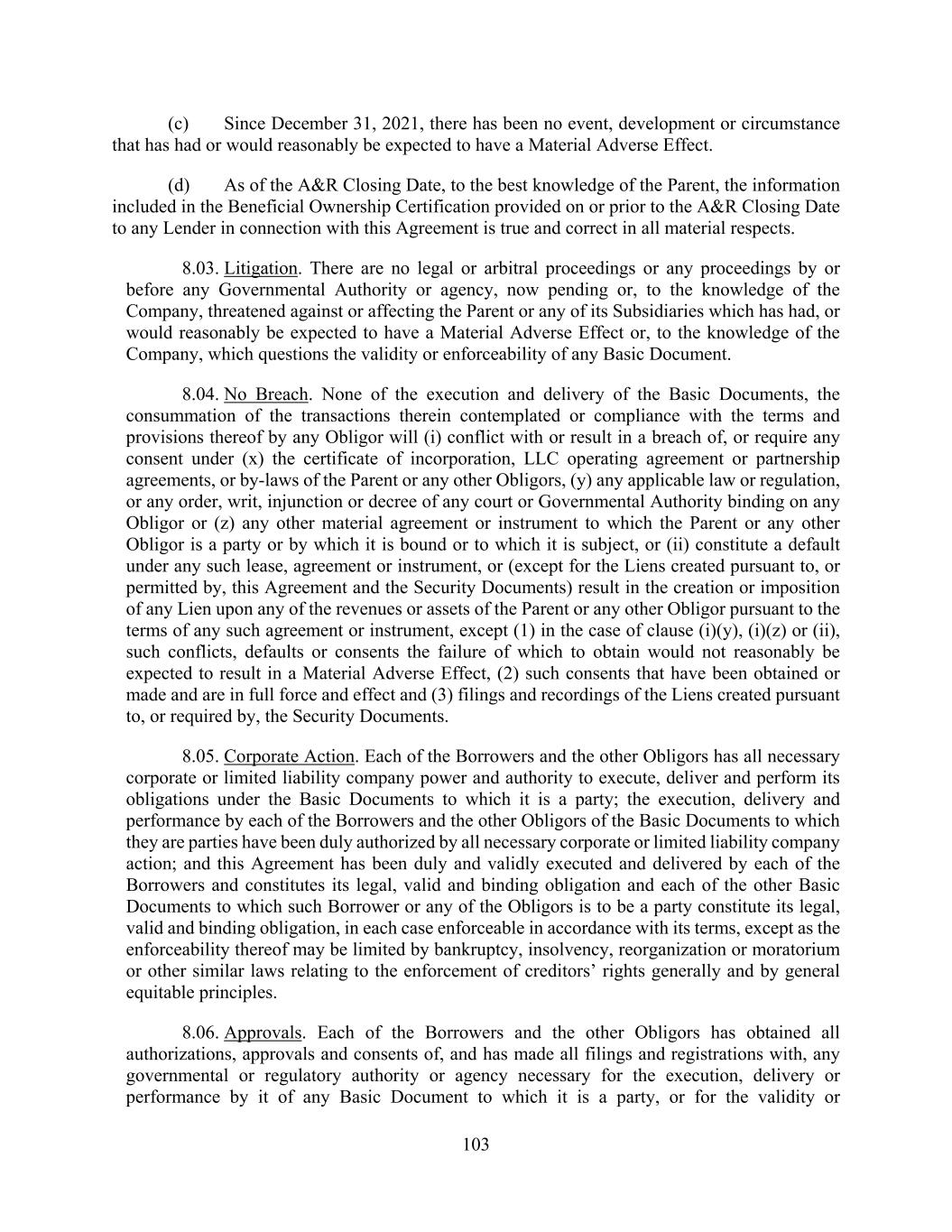 103(c)自2021年12月31日以来,没有发生已经或将合理预期会产生重大不利影响的事件、事态发展或情况。(d)截至A & R截止日期,据母公司所知,在A & R截止日期或之前向任何贷款人提供的与本协议有关的受益所有权证明中包含的信息在所有重大方面都是真实和正确的。8.03.诉讼。没有任何法律或仲裁程序或任何由任何政府当局或机构提出或在其面前提出的任何程序,现正待决,或据公司所知,威胁或影响母公司或其任何附属公司,而该等程序已产生或将合理预期会产生重大不利影响,或据公司所知,质疑任何基本文件的有效性或可执行性。8.04.没有违约。任何义务人执行和交付基本文件、完成其中所设想的交易或遵守其中的条款和规定,均不会(i)与(x)公司注册证书、有限责任公司经营协议或合伙协议、母公司或任何其他义务人的章程、(y)任何适用法律或法规、或任何命令、令状相冲突或导致违反,或要求根据(x)获得任何同意,对任何债务人具有约束力的任何法院或政府当局的强制令或判令,或(z)母公司或任何其他债务人作为一方当事人或其受其约束或受其约束的任何其他重要协议或文书,或(ii)构成任何该等租赁、协议或文书下的违约,或(依据或许可产生的留置权除外,本协议和担保文件)导致根据任何此类协议或文书的条款对母公司或任何其他债务人的任何收入或资产设定或施加任何留置权,但(1)在第(i)(y)、(i)(z)或(ii)条的情况下除外,此类冲突、违约或同意如果未能获得将不会合理地预期会导致重大不利影响,(2)已取得或作出并具有完全效力及效力的该等同意,以及(3)依据或由保证文件规定而设定的留置权的存档及纪录。8.05.企业行动。各借款方和其他义务人拥有所有必要的法人或有限责任公司权力和授权,以执行、交付和履行其作为当事人的基本文件项下的义务;各借款方和其他义务人执行、交付和履行其作为当事人的基本文件已获得所有必要的法人或有限责任公司行动的正式授权;本协议已由各借款方正式有效地执行和交付,并构成其法律,有效和具有约束力的义务以及此类借款人或任何义务人将成为一方当事人的每一份其他基本文件构成其法律、有效和具有约束力的义务,在每种情况下均可根据其条款强制执行,但其可执行性可能受到破产、无力偿债、重组或暂停执行或其他与债权人权利强制执行有关的一般法律和一般衡平法原则的其他类似法律的限制。8.06.批准。各借款方及其他义务人均已取得其为执行、交付或履行其作为缔约方的任何基本文件所必需的任何政府或监管当局或机构的所有授权、批准和同意,并已向其作出所有备案和登记,或为其作为缔约方的任何基本文件的有效性或