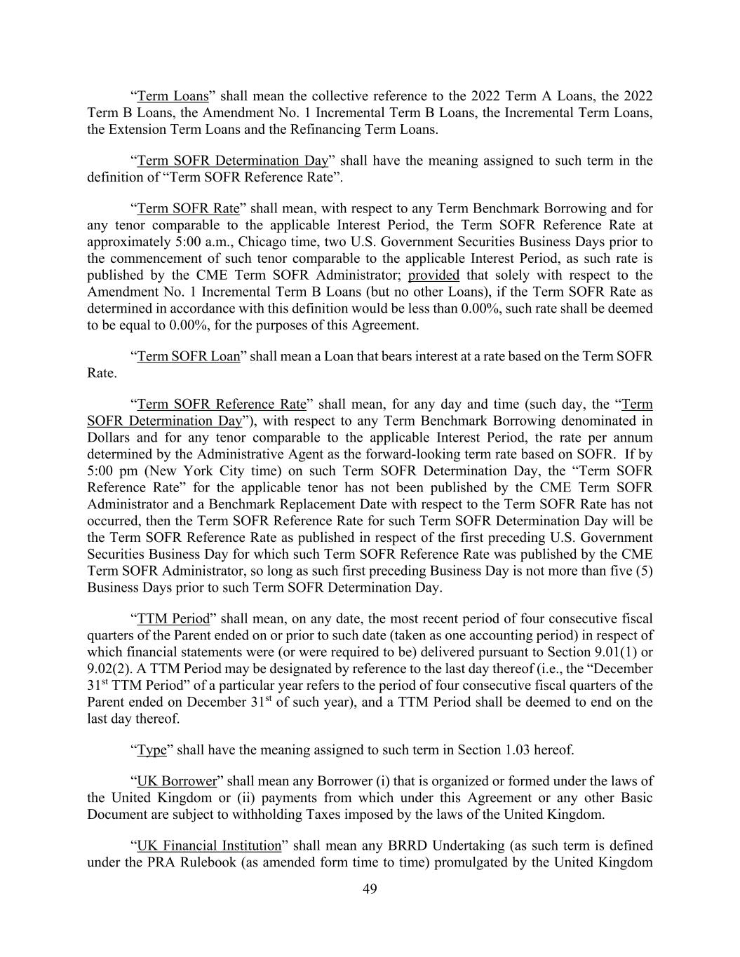 49“定期贷款”是指统称2022年度A期贷款、2022年度B期贷款、修正1号增量B期贷款、增量定期贷款、展期定期贷款和再融资定期贷款。“术语SOFR确定日”应具有“术语SOFR参考利率”定义中赋予该术语的含义。“定期SOFR利率”是指,就任何定期基准借款而言,对于与适用利息期相当的任何期限,芝加哥时间上午5:00左右的定期SOFR参考利率,在该期限开始前两个与适用利息期相当的美国政府证券营业日,因为该利率由CME定期SOFR管理人公布;但仅就第1号修正案的增量B期贷款(但没有其他贷款)而言,如果按照这一定义确定的定期SOFR利率将低于0.00个百分点,就本协议而言,此种费率应被视为等于0.00个百分点。“定期SOFR贷款”是指按定期SOFR利率计息的贷款。“期限SOFR参考利率”是指,就任何以美元计价的期限基准借款和与适用利息期相当的任何期限而言,在任何一天和时间(该日为“期限SOFR确定日”),由行政代理人确定的作为基于SOFR的前瞻性期限利率的年利率。如果在该期限SOFR确定日下午5:00(纽约市时间)之前,适用期限的“期限SOFR参考利率”尚未由CME期限SOFR管理人公布,也未发生与期限SOFR利率相关的基准更换日,则该期限SOFR确定日的期限SOFR参考利率将为该期限SOFR参考利率由该期限SOFR管理人公布的上一个美国政府证券营业日的期限SOFR参考利率,只要该前一个营业日不超过该期限SOFR确定日前五(5)个营业日。“TTM期间”是指在任何日期,根据第9.01(1)或9.02(2)节的规定交付财务报表的母公司在该日期或之前结束的最近一个连续四个财政季度期间(被视为一个会计期间)。TTM期间可以参考其最后一天来指定(即,特定年度的“12月31日TTM期间”是指母公司在该年度的12月31日结束的连续四个财政季度期间),一个TTM期间应被视为在其最后一天结束。“类型”应具有本协议第1.03节赋予该术语的含义。“英国借款人”是指任何借款人(i)是根据英国法律组织或成立的,或(ii)根据本协议或任何其他基本文件支付的款项须缴纳英国法律规定的预扣税。“英国金融机构”是指任何BRRD承诺(因为该术语在英国颁布的PRA规则手册(经不时修订的表格)中定义