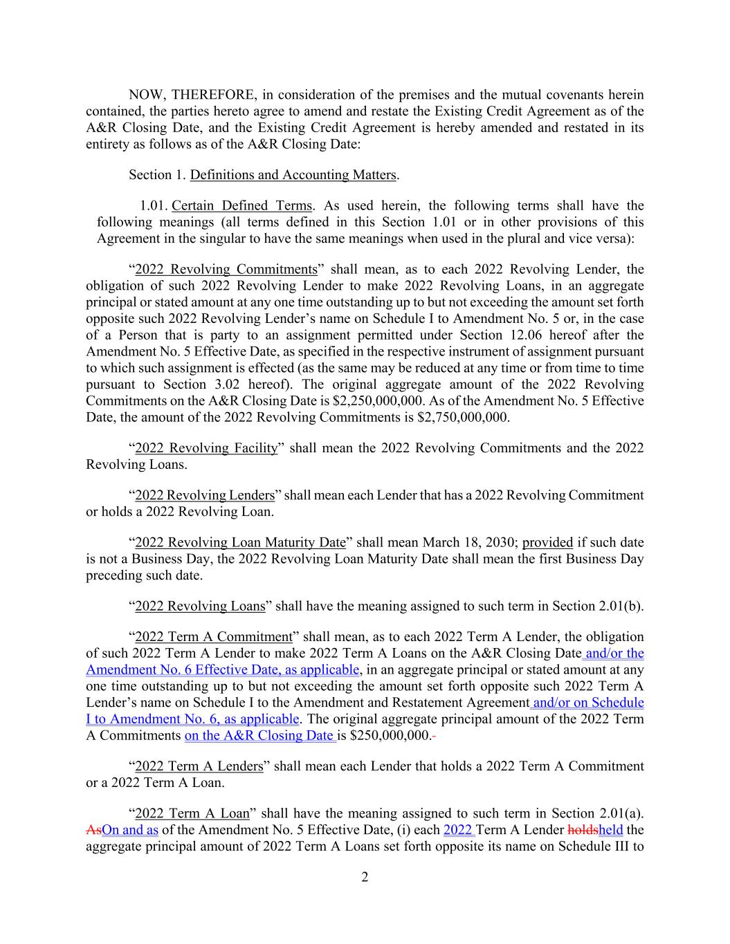 2现在,因此,考虑到本协议所载的前提和共同契约,本协议各方同意修订和重申截至A & R截止日期的现有信贷协议,现将截至A & R截止日期的现有信贷协议全文修订和重申如下:第1节。定义和会计事项。1.01.某些定义的术语。如本文所用,以下术语应具有以下含义(在本节1.01或本协议其他条款中以单数定义的所有术语在以复数形式使用时具有相同含义,反之亦然):“2022循环承诺”是指,就每个2022循环贷款人而言,该2022循环贷款人提供2022循环贷款的义务,在任何一次未偿还的本金总额或规定的数额中,不超过但不超过第5号修正案附表I所列2022年循环贷款人名称相对的数额,或如属在第5号修正案生效日期后根据本条例第12.06条所准许的转让的当事人的人,则为根据其进行此种转让的相应转让文书所指明的数额(因为根据本条例第3.02条可随时或不时减少该数额)。A & R截止日期的2022年循环承诺的原始总额为2,250,000,000美元。截至第5号修正案生效之日,2022年循环承付款项数额为275000000美元。“2022循环贷款”是指2022循环承诺和2022循环贷款。“2022循环放款人”是指拥有2022循环承诺或持有2022循环贷款的每个放款人。“2022年循环贷款到期日”是指2030年3月18日;如果该日期不是营业日,则2022年循环贷款到期日是指该日期之前的第一个营业日。“2022循环贷款”应具有第2.01(b)节赋予该术语的含义。“2022 A期承诺”是指,就每一2022 A期贷款人而言,该2022 A期贷款人有义务在A & R截止日期和/或第6号修订生效日期(如适用)以本金总额或规定的金额在任何一次未偿还的2022 A期贷款不超过但不超过修订和重述协议附表I和/或第6号修订附表I(如适用)中与该2022 A期贷款人名称相对的金额。A & R截止日期的2022年A期承诺的原始本金总额为250,000,000美元。“2022 A期贷款人”是指持有2022 A期承诺或2022 A期贷款的每个贷款人。“2022 A期贷款”应具有第2.01(a)节赋予该术语的含义。因此,自第5号修订生效日期起,(i)每项2022年贷款期限的贷款人持有附表III所列与其名称相对的2022年A期贷款的本金总额至