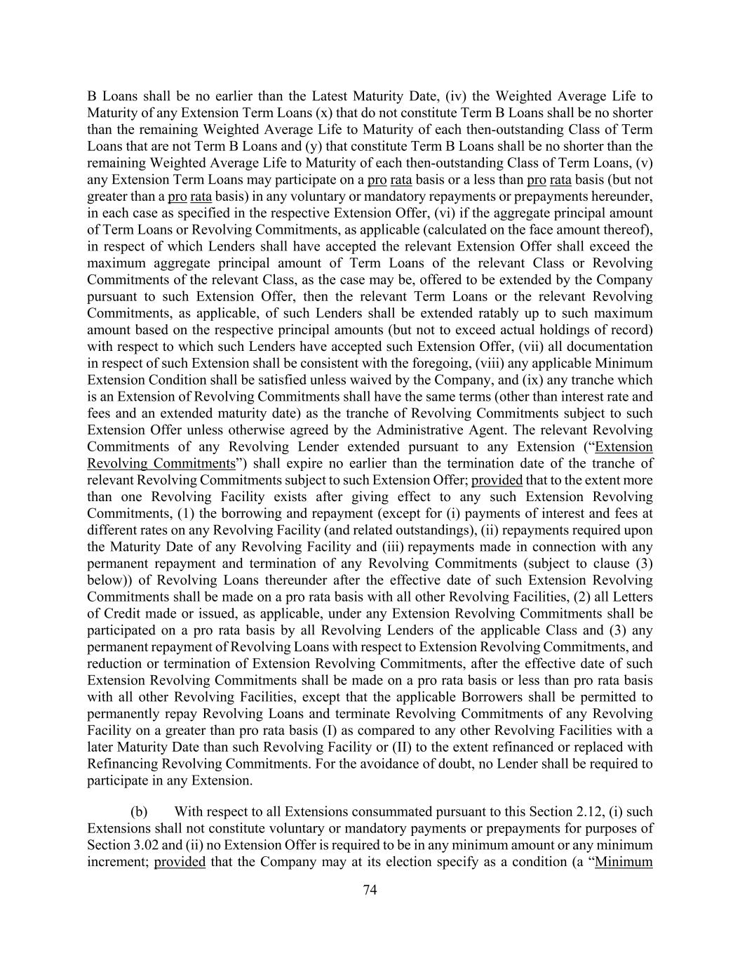 74 B贷款不得早于最后到期日,(iv)任何不构成B期贷款的展期定期贷款(x)的加权平均到期期限,不得短于每项当时未偿还的非B期贷款类别定期贷款的剩余加权平均到期期限,及(y)构成B期贷款的每项当时未偿还类别定期贷款的剩余加权平均到期期限,(v)任何延期定期贷款可按比例或低于比例(但不超过按比例)参与本协议项下的任何自愿或强制性还款或预付款项,在每种情况下,如有关的延期要约中指明,(vi)如贷款人已接受有关延期要约的定期贷款或循环承诺的本金总额(如适用)(按其面值计算),须超过有关类别的定期贷款或相关类别的循环承诺的最高本金总额,视情况而定,公司根据该延期要约提出展期,则该等贷款人的相关定期贷款或相关循环承诺(如适用)应根据该等贷款人已接受该延期要约的各自本金金额(但不超过实际持有的记录)按比例展期至最高金额,(vii)有关该等延期的所有文件应与上述一致,(viii)任何适用的最低延期条件应得到满足,除非公司放弃,及(ix)任何属循环承诺延期的批次,须与受该延期要约规限的循环承诺批次的条款(利率及费用及延期到期日除外)相同,除非行政代理人另有约定。任何循环贷款人根据任何延期延期的相关循环承诺(“延期循环承诺”)应不早于受该延期要约约束的相关循环承诺批次的终止日期到期;但在任何该等延期循环承诺生效后存在不止一项循环融资的情况下,(1)借款和还款(除(i)以不同利率支付任何循环融资的利息和费用(以及相关未偿还)外,(ii)在任何循环贷款到期日所需的偿还,以及(iii)在该等延期生效日期后就循环贷款的任何永久偿还及终止(受下文第(3)条规限)而作出的偿还,循环承诺须与所有其他循环贷款按比例作出,(2)所有作出或发出的信用证(如适用),根据任何延期循环承诺,应由适用类别的所有循环贷款人按比例参与,以及(3)与延期循环承诺有关的循环贷款的任何永久偿还,以及延期循环承诺的减少或终止,在此类延期生效日期之后,循环承诺应与所有其他循环设施按比例或低于比例进行,除非适用的借款人应被允许永久偿还循环贷款并终止任何循环贷款的循环承诺,其比例高于(i)与任何其他到期日比该循环贷款更晚的循环贷款或(II)在再融资循环承诺或以再融资循环承诺取代的范围内。为免生疑问,不得要求任何贷款人参与任何延期。(b)就依据本条第2.12条完成的所有延期而言,(i)就第3.02条而言,该等延期不构成自愿或强制性付款或预付款项,及(ii)无须以任何最低金额或任何最低增量提出延期要约;但公司可在其选择时指明作为条件(a "最低