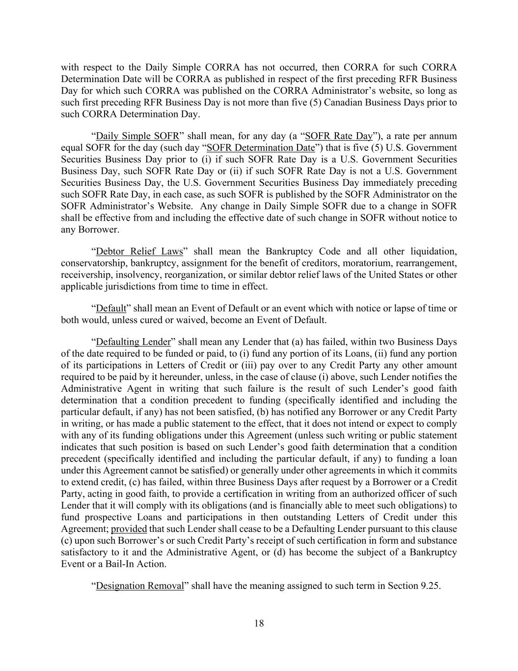 18关于Daily Simple CORRA尚未发生,则此类CORRA确定日期的CORRA将为在CORRA管理员网站上发布此类CORRA的前一个RFR营业日发布的CORRA,只要此类前一个RFR营业日不超过该CORRA确定日前五(5)个加拿大营业日。“每日简单SOFR”是指,就任何一天(“SOFR利率日”)而言,(i)如果该SOFR利率日是美国政府证券营业日,则该SOFR利率日或(ii)如果该SOFR利率日不是美国政府证券营业日,则紧接在该SOFR利率日之前的美国政府证券营业日(在每种情况下,因为该SOFR由SOFR管理员在SOFR管理员的网站上发布。Daily Simple SOFR因SOFR变更而发生的任何变更,自SOFR变更生效之日起生效,包括该变更生效之日起生效,恕不通知任何借款人。“债务人救济法”是指《破产法》和所有其他清算、监管、破产、为债权人的利益而转让、暂停、重新安排、接管、破产、重组或美国或其他不时生效的适用法域的类似债务人救济法。“违约”是指违约事件或经通知或时间推移或两者兼而有之的事件,除非得到纠正或豁免,否则将成为违约事件。“违约贷款人”是指任何贷款人(a)未能在要求提供资金或付款之日起两个营业日内(i)为其贷款的任何部分提供资金,(ii)为其参与信用证的任何部分提供资金,或(iii)向任何信用方支付其根据本协议要求支付的任何其他金额,除非在上述第(i)款的情况下,该贷款人书面通知行政代理人,此种失败是该贷款人善意地确定资金的先决条件(具体确定并包括特定违约,如果有的话)未得到满足的结果,(b)已书面通知任何借款人或任何信用方,或已作出大意的公开声明,其不打算或预期遵守其在本协议下的任何筹资义务(除非此类书面或公开声明表明此类立场是基于该贷款人的善意确定,即无法满足根据本协议为贷款提供资金的先决条件(具体确定并包括特定违约,如果有的话))或一般根据其承诺提供信贷的其他协议,(c)在借款人或信用方提出请求后三个工作日内未能诚信行事,提供该贷款人的获授权人员的书面证明,证明其将遵守其义务(并在财务上有能力履行该义务),为本协议项下的预期贷款和参与当时未偿还的信用证提供资金;但该贷款人在该借款人或该信用方收到其和行政代理人满意的形式和实质的该证明后,或(d)已成为破产事件或保释诉讼的主体后,即根据本条款(c)终止为违约贷款人。“指定删除”应具有第9.25节中赋予该术语的含义。