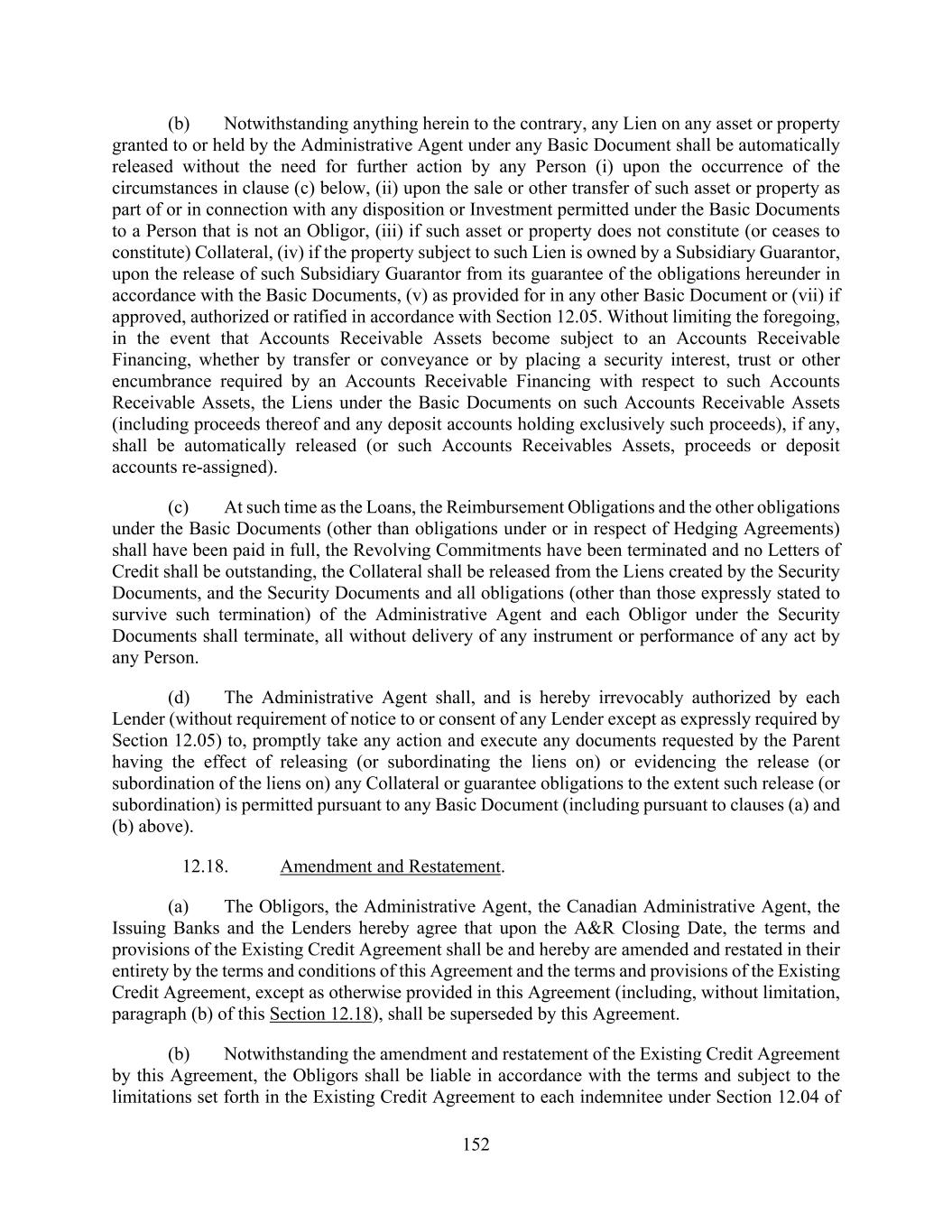 152(b)尽管本文另有相反规定,行政代理人根据任何基本文件批给或持有的任何资产或财产上的任何留置权,须自动解除,而无须任何人(i)在以下(c)条的情况发生时采取进一步行动,(ii)在将该资产或财产作为基本文件所准许的任何处分或投资的一部分或与其有关的任何资产或财产出售或以其他方式转让予并非债务人的人时,(iii)如该等资产或财产不构成(或不再构成)抵押品,(iv)如受该留置权规限的财产由附属担保人拥有,则在该附属担保人根据基本文件解除其对本协议项下义务的担保时,(v)如任何其他基本文件所规定,或(vii)如根据第12.05条批准、授权或批准。在不限制前述规定的情况下,如果应收账款资产成为应收账款融资的标的,无论是通过转让或转让,还是通过设置担保权益、信托或应收账款融资所要求的与该应收账款资产相关的其他产权负担,则应自动解除基本文件项下关于该应收账款资产(包括其收益和专门持有该收益的任何存款账户)的留置权(如有)(或重新转让该应收账款资产、收益或存款账户)。(c)在贷款、偿还义务和基本单证项下的其他义务(套期保值协议项下或与其有关的义务除外)已全额支付时,循环承诺已终止且不得有未结清的信用证,担保物应解除担保单证产生的留置权,而行政代理人和担保单证项下各义务人的担保单证和所有义务(明确说明在此种终止后仍有效的义务除外)均应终止,所有这些都没有交付任何文书或由任何人履行任何作为。(d)行政代理人须,并在此获各贷款人不可撤销授权(除第12.05条明文规定外,无须向任何贷款人发出通知或表示同意),迅速采取任何行动及签立父母要求的任何文件,该文件具有解除(或使留置权从属)或证明解除(或使留置权从属)任何抵押或担保义务的效力,但该解除(或从属)是根据任何基本文件(包括根据上述(a)及(b)条)所允许的范围。12.18.修正和重述。(a)债务人、行政代理人、加拿大行政代理人、发行银行和贷款人特此同意,在A & R截止日期,现有信贷协议的条款和规定应并在此被本协议的条款和条件以及现有信贷协议的条款和规定全部修订和重述,但本协议另有规定的除外(包括但不限于本第12.18条(b)款),应由本协议取代。(b)尽管本协议对现有信贷协议进行了修订和重述,但债务人仍须按照现有信贷协议中规定的条款和限制,根据第12.04条对每一受偿人承担责任。