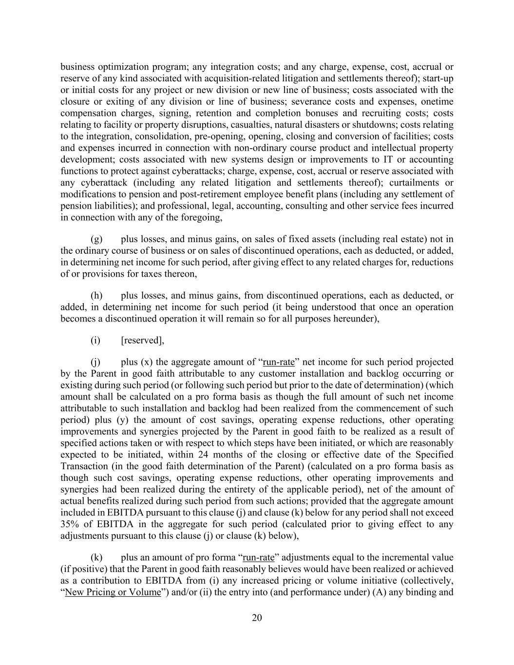 20业务优化方案;任何整合成本;以及与收购相关的诉讼及其和解相关的任何费用、费用、成本、应计或准备金);任何项目或新部门或新业务线的启动或初始成本;与任何部门或业务线的关闭或退出相关的成本;遣散费和开支、一次性补偿费用、签约、保留和完成奖金以及招聘成本;与设施或财产中断、伤亡、自然灾害或停工相关的成本;与整合、合并、开业前、开业、关闭和转换设施;与非普通课程产品和知识产权开发相关的成本和费用;与新系统设计或改进IT或会计功能以防范网络攻击相关的成本;与任何网络攻击(包括任何相关的诉讼和和解)相关的费用、费用、成本、应计或准备金;削减或修改养老金和退休后雇员福利计划(包括任何养老金负债的结算);以及与上述任何一项相关的专业、法律、会计、咨询和其他服务费用,(g)加损失,减收益,出售非在正常经营过程中的固定资产(包括房地产)或出售已终止经营业务,每项在确定该期间的净收入时扣除或增加,在对其产生的任何相关费用、减少税项或拨备生效后,(h)加上已终止经营业务的亏损和减收益,每项在确定该期间的净收入时扣除或增加(但有一项谅解,即一旦某项经营业务成为已终止经营业务,则就本协议下的所有目的而言,(i)[保留],(j)加上(x)母公司善意预测的可归因于在该期间(或在该期间之后但在确定日期之前)发生或存在的任何客户安装和积压的该期间的“运行率”净收入总额(该数额应按形式计算,犹如可归因于该安装和积压的该等净收入的全部金额已从该期间开始实现)加上(y)成本节约、运营费用减少的金额,母公司善意预计在指定交易结束或生效之日起24个月内(由母公司善意确定)因所采取的特定行动或已启动或合理预期将启动的措施而实现的其他经营改善和协同增效(按备考基础计算,如同此类成本节约、经营费用减少、其他经营改善和协同增效已在整个适用期间内实现),扣除在该期间从这些行动中实现的实际利益的数额;但任何期间根据本(j)条和下文(k)条计入EBITDA的总额不得超过该期间EBITDA总额的35%(在根据本(j)条或下文(k)条实施任何调整之前计算),(k)加上相当于母公司善意合理地认为本可实现或实现的增量价值(如果为正值)的备考“运行率”调整金额,因为(i)任何增加定价或数量的举措(统称为“新定价或数量”)和/或(ii)进入(以及根据)(a)任何具有约束力和