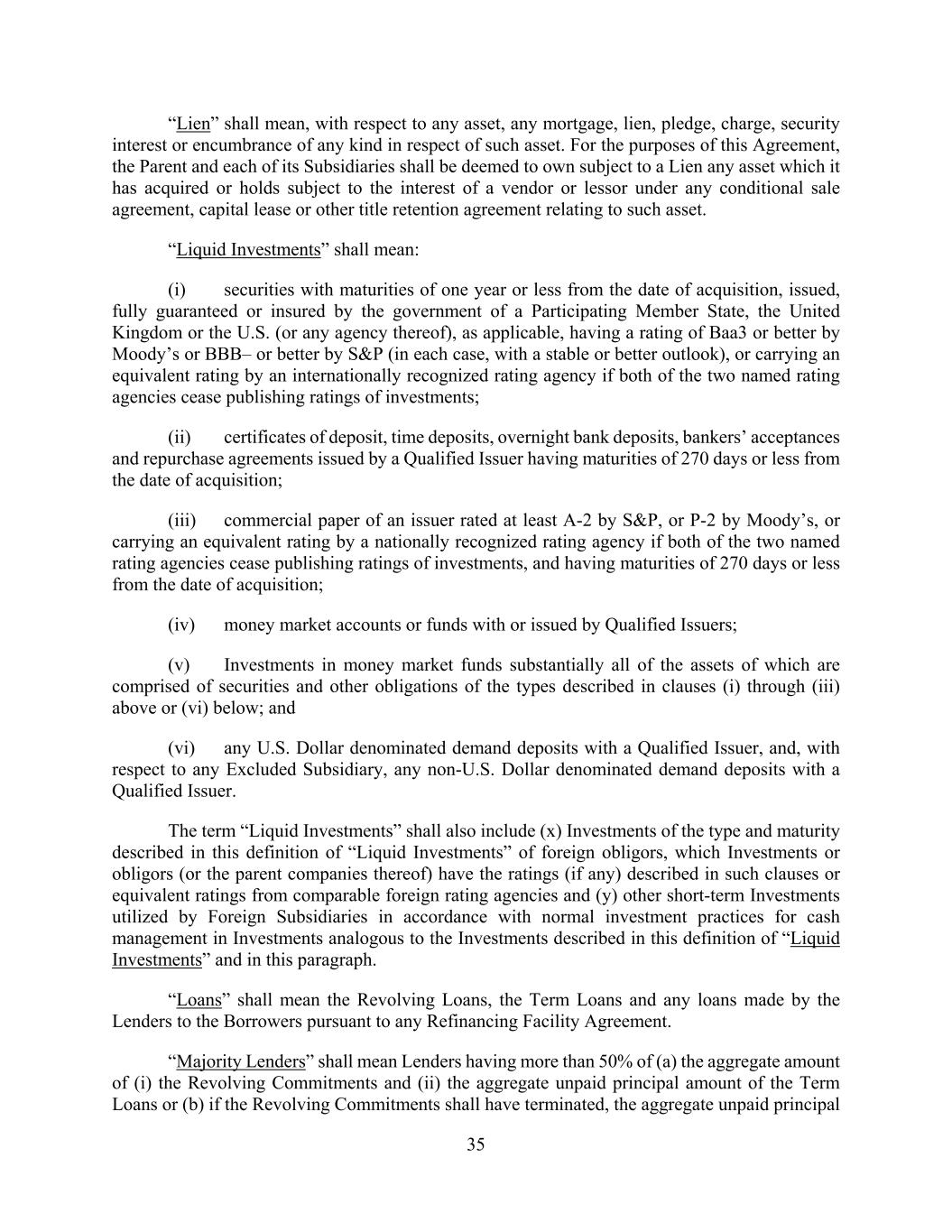 35“留置权”就任何资产而言系指与该资产有关的任何抵押、留置权、质押、押记、担保权益或任何种类的产权负担。就本协议而言,母公司及其每一家子公司应被视为拥有其根据与该资产有关的任何有条件销售协议、资本租赁或其他所有权保留协议在卖方或出租人的利益下获得或持有的任何资产,但须受留置权约束。“流动性投资”是指:(i)由参与成员国政府、英国或美国(或其任何机构)(如适用)发行、全额担保或投保的、由穆迪或BBB评级为Baa3或更高或更高——或由标普评级为更高(在每种情况下,前景稳定或更好)的、自收购之日起一年或更短期限的证券,或在两个指定评级机构均停止公布投资评级的情况下,由国际公认评级机构给予同等评级;(ii)存款证、定期存款、由合格发行人发行的期限为自收购之日起270天或以下的隔夜银行存款、银行承兑汇票和回购协议;(iii)至少被标普评为A-2或被穆迪评为P-2的发行人的商业票据,或在两家指定的评级机构均停止公布投资评级的情况下由国家认可的评级机构进行同等评级的商业票据,且自收购之日起到期日为270天或更短;(iv)与合格发行人或由合格发行人发行的货币市场账户或基金;(v)对货币市场基金的投资,其资产基本上全部由上文第(i)至(iii)或下文第(vi)条所述类型的证券和其他债务组成;(vi)与合格发行人的任何以美元计价的活期存款,以及就任何被排除的子公司而言,与合格发行人的任何非美元计价的活期存款。“流动性投资”一词还应包括(x)外国债务人的“流动性投资”这一定义中所述类型和期限的投资,这些投资或债务人(或其母公司)具有此类条款中所述的评级(如有)或可比外国评级机构的同等评级,以及(y)外国子公司按照正常投资惯例在类似于本“流动性投资”定义和本款中所述投资的投资中进行现金管理所使用的其他短期投资。“贷款”是指循环贷款、定期贷款以及贷款人根据任何再融资便利协议向借款人提供的任何贷款。“多数贷款人”是指拥有(a)(i)循环承诺的总额和(ii)定期贷款的未付本金总额的50%以上的贷款人,或(b)如果循环承诺已终止,则未付本金总额