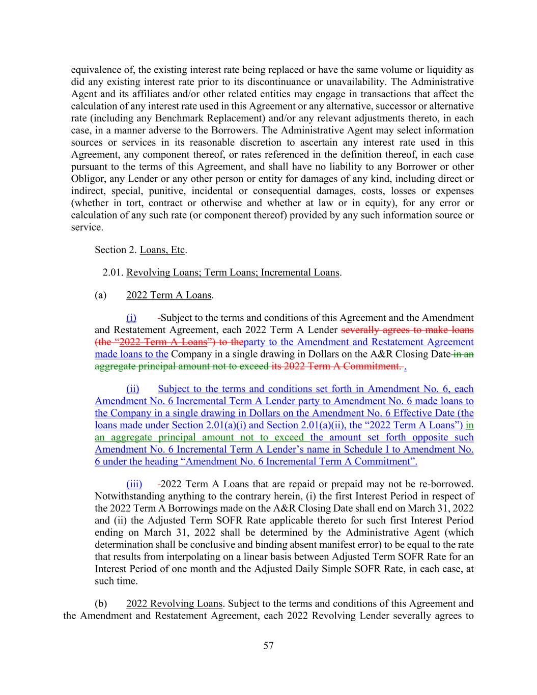 57等价,现有利率被取代或具有与任何现有利率终止或不可用之前相同的数量或流动性。行政代理人及其附属机构和/或其他相关实体可能以对借款人不利的方式参与影响计算本协议中使用的任何利率或任何替代、继承或替代利率(包括任何基准替代)和/或对其任何相关调整的交易。行政代理人可根据本协议的条款,在其合理的酌处权范围内选择信息来源或服务,以确定本协议中使用的任何利率、其任何组成部分或其定义中提及的利率,在每种情况下,均不对任何借款人或其他义务人、任何贷款人或任何其他个人或实体承担任何类型的损害赔偿责任,包括直接或间接、特殊、惩罚性、附带或后果性损害赔偿、费用、损失或开支(无论是在侵权、合同或其他方面,还是在法律或权益方面),对于任何此类信息源或服务提供的任何此类费率(或其组成部分)的任何错误或计算。第2节。贷款等2.01。循环贷款;定期贷款;增量贷款。(a)2022年A期贷款。(i)在符合本协议及修订及重述协议的条款及条件下,各2022年期限A贷款人分别同意向修订及重述协议的一方于A & R截止日期以美元单次提款向公司提供贷款(“2022年A期贷款”),本金总额不超过其2022年A期承诺。(ii)在符合第6号修订所载的条款及条件下,每项第6号修订的增额期限第6号修订的贷款方在第6号修订生效日期以美元单次提款向公司提供贷款(根据第2.01(a)(i)条和第2.01(a)(ii)条作出的贷款,“2022年A期贷款”),本金总额不超过该第6号修订附表I中“第6号修订的增额期限A项承诺”标题下的贷款方名称所列的金额。(iii)已偿还或预付的2022 A期贷款不得再借。尽管本文另有相反规定,(i)于A & R截止日进行的2022年A期借款的第一个计息期应于2022年3月31日结束,及(ii)于3月31日结束的该第一个计息期适用的经调整的定期SOFR利率,2022年度应由行政代理人确定(该确定应是决定性的,在没有明显错误的情况下具有约束力),以等于在每种情况下在该时间对一个月利息期的调整后期限SOFR利率与调整后的每日简单SOFR利率之间进行线性插值所产生的利率。(b)2022年循环贷款。根据本协议及修订及重述协议的条款及条件,各2022年度循环贷款人分别同意