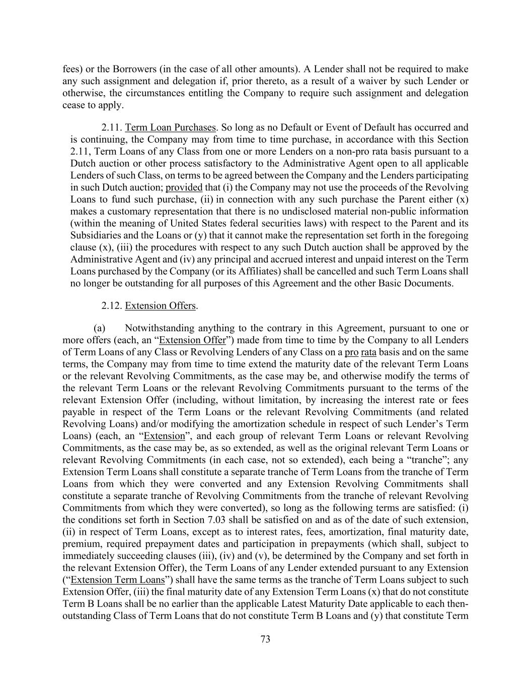 73费用)或借款人(在所有其他金额的情况下)。如在此之前,由于该贷款人的放弃或其他原因,使公司有权要求该转让及转授的情况不再适用,则贷款人无须作出任何该等转让及转授。2.11.定期贷款购买。只要没有发生违约或违约事件且仍在继续,公司可根据本第2.11条不时根据荷兰式拍卖或向该类别所有适用贷款人开放的行政代理人满意的其他程序,按照公司与参与该荷兰式拍卖的贷款人之间商定的条款,从一个或多个贷款人非按比例购买任何类别的定期贷款;但前提是(i)公司不得使用循环贷款的收益为此类购买提供资金,(ii)就任何该等购买而言,母公司要么(x)作出惯常陈述,表示不存在有关母公司及其子公司和贷款的未披露的重大非公开信息(在美国联邦证券法的含义内),要么(y)无法作出上述(x)条所述的陈述,(iii)有关任何该等荷兰式拍卖的程序须经行政代理人批准,及(iv)公司(或其附属公司)购买的定期贷款的任何本金及应计利息及未付利息应予取消,而就本协议及其他基本文件的所有目的而言,该等定期贷款不再未偿还。2.12.延期优惠。(a)尽管本协议另有相反规定,根据公司不时按比例及以相同条款向任何类别的定期贷款的所有贷款人或任何类别的循环贷款人作出的一项或多于一项要约(每项均称为“延期要约”),公司可不时延长有关定期贷款或有关循环承诺的到期日(视属何情况而定),及根据相关延期要约的条款以其他方式修改相关定期贷款或相关循环承诺的条款(包括但不限于通过提高就定期贷款或相关循环承诺(及相关循环贷款)应付的利率或费用和/或修改就该等贷款人的定期贷款的摊销时间表)(每项“延期”,以及每组相关定期贷款或相关循环承诺(视情况而定)经如此延期,以及原相关定期贷款或相关循环承诺(在每种情况下,未如此延期),每一项均为“部分”;任何延期定期贷款应构成与其所转换的定期贷款部分不同的定期贷款部分,任何延期循环承诺应构成与其所转换的相关循环承诺部分不同的循环承诺部分),只要满足以下条款:(i)第7.03条规定的条件应在此类延期之日及截至该日期满足,(ii)就定期贷款而言,利率、费用、摊销、最终到期日除外,溢价、规定的提前还款日期及参与提前还款(须根据紧接其后的第(iii)、(iv)及(v)条,由公司厘定并载于有关延期要约中),任何贷款人根据任何延期而延长的定期贷款(“延期定期贷款”)的条款,须与受该延期要约规限的定期贷款的批次的条款相同,(iii)任何不构成B期贷款的延展定期贷款(x)的最后到期日,不得早于适用于不构成B期贷款的各未偿还类别定期贷款及构成B期贷款的(y)的适用最迟到期日