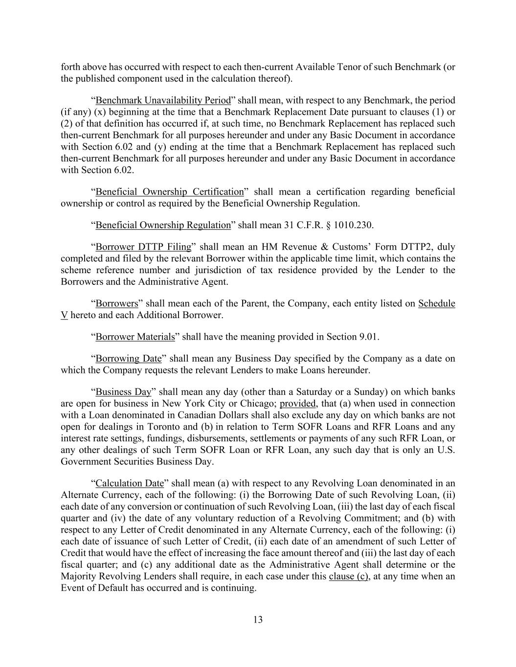 就此种基准(或计算基准时使用的已公布组成部分)的每个当时可用的期限而言,发生了上述13项。“基准不可用期间”就任何基准而言系指自根据该定义第(1)或(2)条的基准替换日期发生之时开始的期间(如有)(x),如果此时没有根据第6.02节和(y)节为本协议项下和任何基本文件项下的所有目的和在根据第6.02节为任何基本文件项下和根据任何基本文件项下的所有目的的基准替换已取代该当时的基准时结束。“实益所有权证明”是指《实益所有权条例》要求的关于实益所有权或控制权的证明。“实益所有权监管”是指31 C.F.R. § 1010.230。“借款人DTTP备案”是指由相关借款人在适用期限内妥为填写并备案的英国税务海关总署表格DTTP2,其中包含贷款人向借款人和行政代理人提供的方案参考编号和税务居住地管辖权。“借款人”是指母公司、公司、本协议附表V所列的每个实体以及每个额外的借款人。“借款人材料”应具有第9.01条规定的含义。“借款日”是指公司指定的任何营业日,作为公司要求相关贷款人根据本协议提供贷款的日期。“营业日”是指在纽约市或芝加哥的银行营业的任何一天(星期六或星期日除外);但(a)当用于与以加元计价的贷款有关时,还应排除银行在多伦多不营业的任何一天,以及(b)与定期SOFR贷款和RFR贷款以及任何此类RFR贷款的任何利率设置、资金、支付、结算或付款,或此类定期SOFR贷款或RFR贷款的任何其他交易有关的任何一天,任何这类仅为美国政府证券营业日的日子。“计算日期”是指(a)就任何以替代货币计值的循环贷款而言,以下各条:(i)该循环贷款的借款日,(ii)该循环贷款的任何转换或延续的每个日期,(iii)每个财政季度的最后一天,以及(iv)自愿减少循环承诺的日期;(b)就任何以任何替代货币计值的信用证而言,以下各条:(i)该信用证的每个签发日期,(ii)该等信用证的修订的每个日期,而该修订的效果将会增加其票面金额,及(iii)每个财政季度的最后一天;及(c)行政代理人根据本条(c)所厘定的任何额外日期,或多数循环放款人在违约事件已发生及仍在继续的任何时间所规定的任何额外日期。