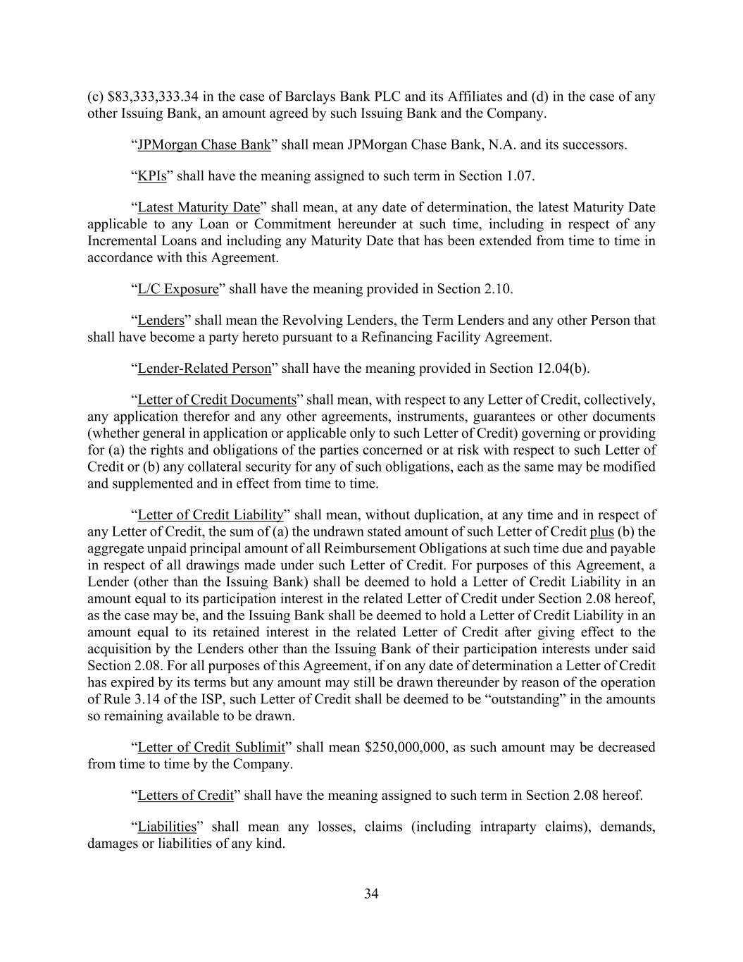 34(c)对于巴克莱银行 PLC及其关联公司为83,333,333.34美元,对于任何其他开证银行为(d)该开证银行与公司商定的金额。“摩根大通银行”是指摩根大通Bank,N.A.及其继任者。“KPI”应具有第1.07节中赋予该术语的含义。“最晚到期日”是指,在任何确定日期,在该时间适用于本协议项下任何贷款或承诺的最晚到期日,包括就任何增量贷款而言,包括根据本协议不时延长的任何到期日。“信用证风险敞口”具有第2.10节规定的含义。“贷款人”是指循环贷款人、定期贷款人以及根据再融资融资协议应已成为本协议一方的任何其他人。“与贷款人有关的人”应具有第12.04(b)节规定的含义。“信用证单据”是指就任何信用证而言,统称为有关的任何申请以及任何其他协议、票据、担保或其他单据(不论是一般适用或仅适用于该信用证),这些单据或单据管辖或规定(a)有关各方的权利和义务或就该信用证承担风险的各方或(b)任何该等义务的任何抵押担保,每一份单据均可予以修改和补充,并不时生效。“信用证责任”是指,在任何时候,就任何信用证而言,(a)该信用证的未提取说明金额加上(b)根据该信用证作出的所有提款在该时间到期和应付的所有偿还义务的未付本金总额之和,不得重复。就本协议而言,贷款人(开证行除外)应被视为持有与其根据本协议第2.08条(视情况而定)在相关信用证中的参与权益相等的金额的信用证责任,而开证行应被视为持有与其在相关信用证中的保留权益相等的金额的信用证责任,在开证行以外的贷款人根据上述第2.08条取得其参与权益生效后。就本协议的所有目的而言,如果在任何确定日期,信用证已按其条款到期,但由于ISP规则3.14的运作,仍可根据该条款提取任何金额,则该信用证应被视为在如此剩余可提取的金额中“未偿还”。“信用证分限额”是指250,000,000美元,因为该金额可能会由公司不时减少。“信用证”应具有本协议第2.08节赋予该术语的含义。“责任”是指任何损失、索赔(包括党内索赔)、要求、损害赔偿或者任何种类的责任。