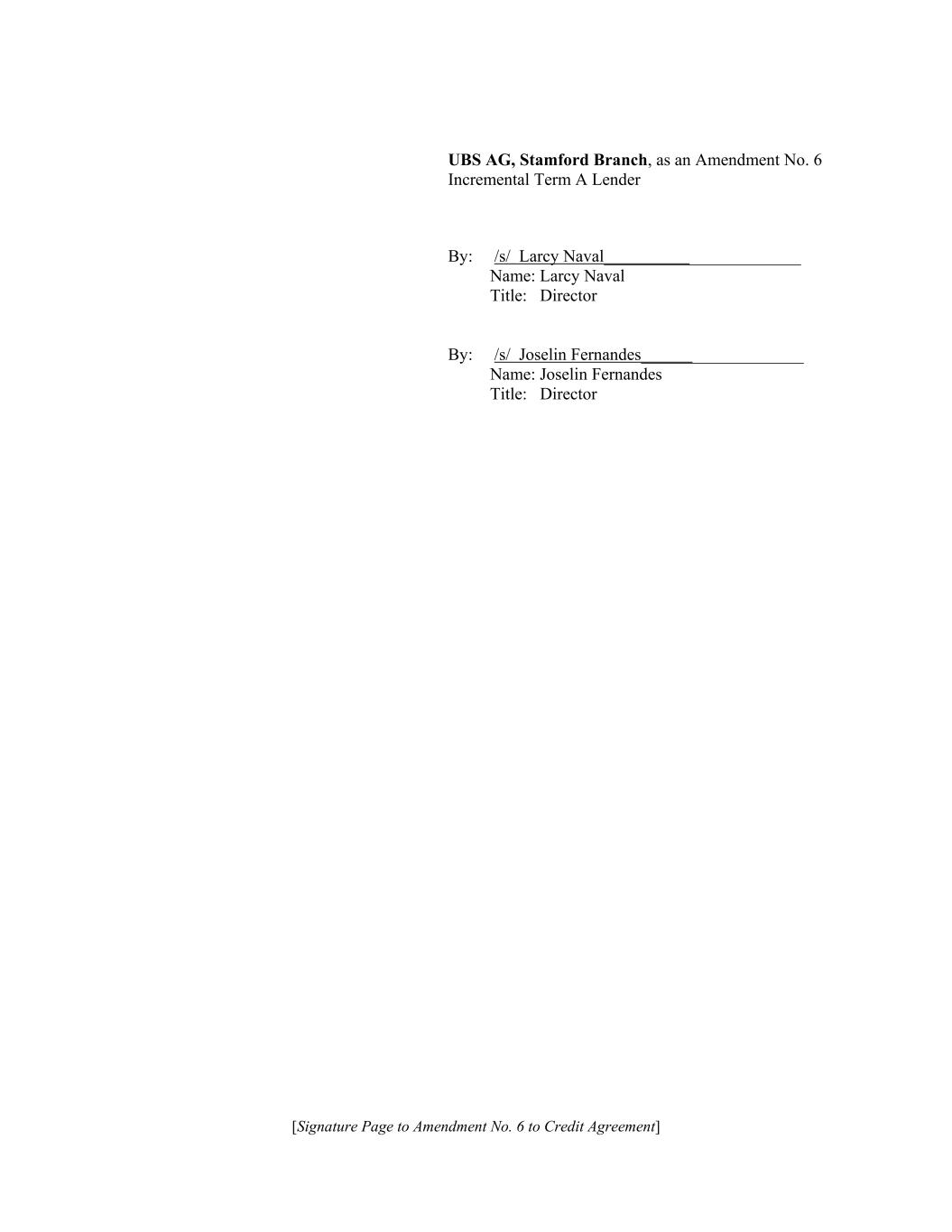 【信贷协议第6号修正案签署页】UBS AG,Stamford Branch,作为第6号修正案增量条款贷款人:/s/larcy Naval ______________________姓名:larcy Naval职务:董事:/s/Joselin Fernandes __________________姓名:Joselin Fernandes职务:董事